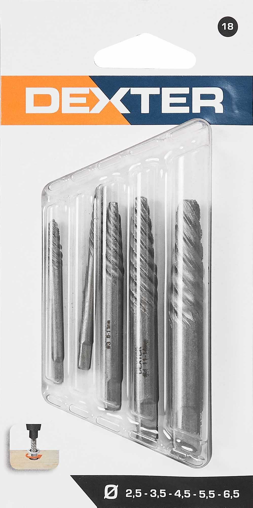 Экстракторы Dexter позволяют легко извлечь из различных материалов сломанные шурупы. Набор в блистерной упаковке содержит 5 экстракторов диаметрами от 3 до 18 мм с шестигранными хвостовиками. Для извлечения сломанного метиза в нем сверлится отверстие, в которое вставляется экстрактор и поворачивается против часовой стрелки. Благодаря шестигранному хвостовику инструмент надежно закрепляется в патроне дрели или шуруповерта. Вес упаковки составляет 110 г.