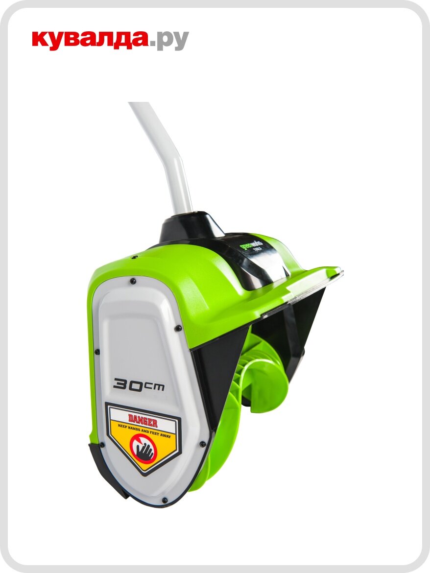 | Прочие особенности и свойства | Снегоуборщик аккумуляторный Greenworks GD40SSK5 - это новая модель из линейки 40V. Она имеет компактный размер и предназначена для облегчения уборки территорий от снега. Такая снегоуборочная лопата станет незаменимым помощником для владельцев частных домов или отдельных гаражей., Данная модель оснащена передовым бесщеточным двигателем. Благодаря отсутствию трения щеток он имеет ряд преимуществ:, Более продолжительный срок службы;, Низкий уровень шума и вибрации;, Минимальное обслуживание;, Высокий крутящий момент;, Компактность и малый вес;, Большая мощность;, Экологичность., Для снегоуборочных лопат характерна одноступенчатая система очистки. Принцип ее работы заключается в заборе снега шнеком и выбросе его через выходное отверстие. Такой принцип подходит для уборки мягкого снега при небольшой высоте снежного покрова., Захват шириной 30 см. подходит для очистки от снега небольших территорий, например, около дома или гаража, а также для расчистки садовых дорожек., Шнек выполнен из АBS пластика. Такой материал выбран не случайно, пластик легкий и не нагружает двигатель, а главное такой шнек не царапает декоративные покрытия., Высокая скорость вращения шнека без нагрузки - 1800 об/мин - позволяет отбрасывать снег на дальнее расстояние., Дальность выброса производится на расстояние до 6 м. Направление выброса не меняется, снег выбрасывается только вперед., Кнопка-предохранитель защищает от случайного включения., , Для запуска инструмента нужно зажать кнопку блокировки и пусковой рычаг., Для безопасной работы электролопата оснащена ключом безопасности. Это важная деталь для техники, так как она предотвращает случайное включение инструмента. При работе снегоуборщика ключ должен быть вставлен. К примеру, если необходимо очистить шнек, то ОБЯЗАТЕЛЬНО нужно вынуть ключ безопасности во избежание получения серьезных травм., Устройство имеет удобную рукоятку с упором в предплечье и дополнительную D-образную ручку. Для удобства хранения и транспортировки лопата легко разбирается и складывается пополам., В комплекте данного снегоуборщика имеется аккумулятор линейки 40V ёмкостью 5 А/ч. Время работы устройства с этой батареей составляет до 40 мин., , Инструмент может работать также от аккумуляторов емкостью 2 А/ч, 4 А/ч и 8 А/ч линейки 40V, которые можно приобрести дополнительно. Все аккумуляторы универсальны, их можно использовать для всех инструментов одной серии. |