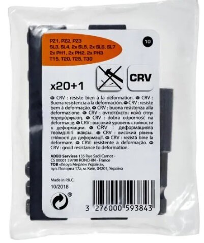 | Состав комплекта | Биты - PZ1, PZ2, PZ3, PH1, PH2, PH3, SL3, SL4, SL5, SL6, SL7, T15, T20, T25, T30 |