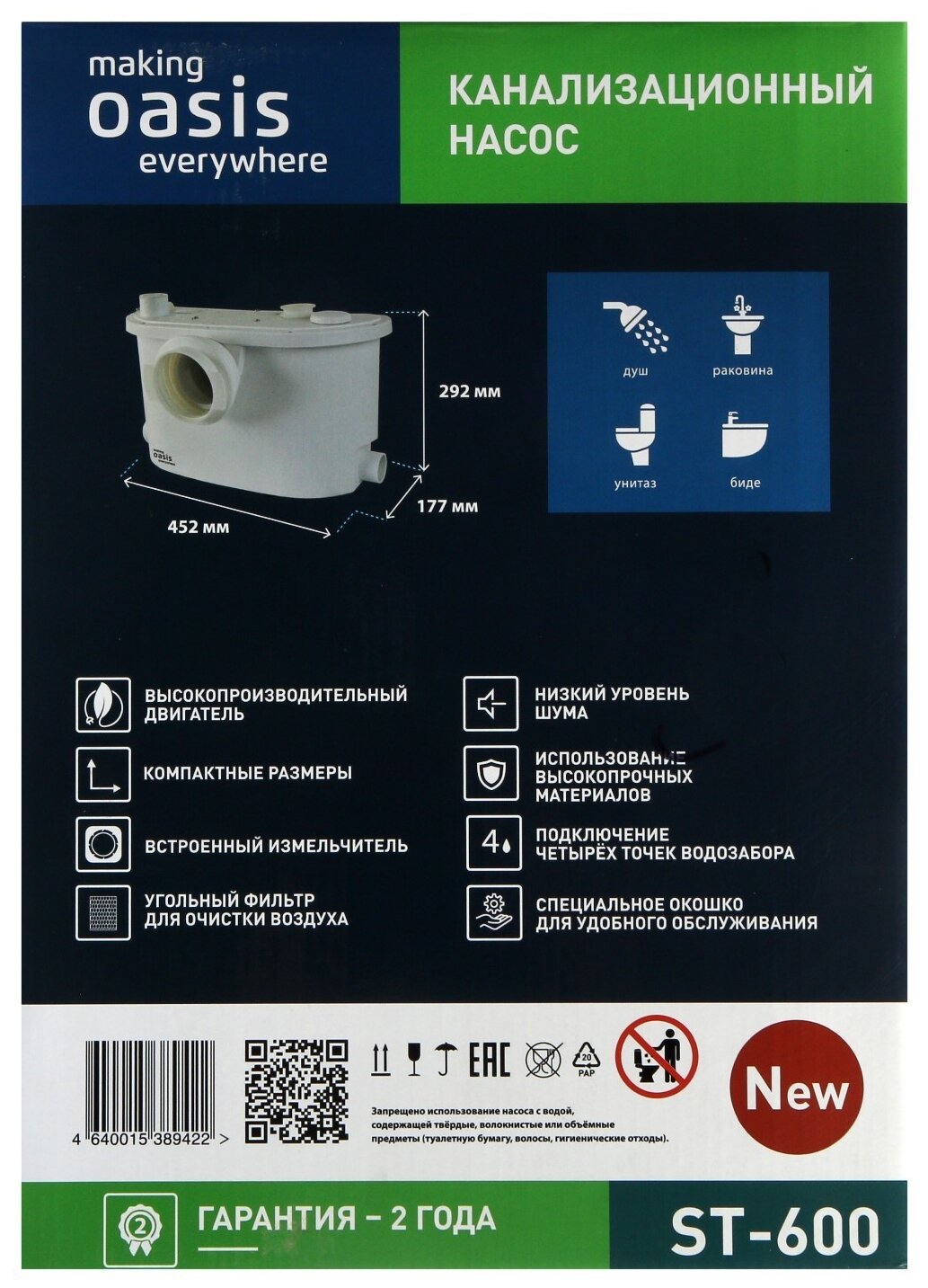 Насос Oasis ST-600 имеет небольшие габариты и легкий вес, что делает его компактным и удобным в использовании. Он подходит для различных задач, связанных с перекачкой жидкостей, и будет надежным помощником в любых условиях.