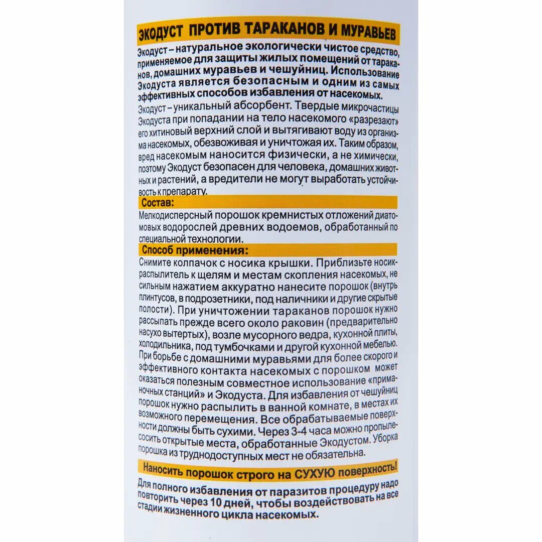 | Инструкция по применению | Снимите колпачок с носика крышки. Приблизьте носик-распылитель к щелям и местам скопления насекомых, не сильным нажатием аккуратно нанесите порошок (внутрь плинтусов, в подрозетники, под наличники и другие скрытые полости). При уничтожении тараканов порошок нужно рассыпать прежде всего около раковин (предварительно насухо вытертых), возле мусорного ведра, кухонной плиты, холодильника, под тумбочками и другой кухонной мебелью. При борьбе с домашними муравьями для более скорого и эффективного контакта насекомых с порошком может оказаться полезным совместное использование «приманочных станций» и Экодуста. Для избавления от чешуйниц порошок нужно распылить в ванной комнате, в местах их возможного перемещения. Все обрабатываемые поверхности должны быть сухими. Через 3-4 часа можно пропылесосить открытые места, обработанные Экодустом. Уборка порошка из труднодоступных мест не обязательна. Наносить порошок строго на СУХУЮ поверхность! |