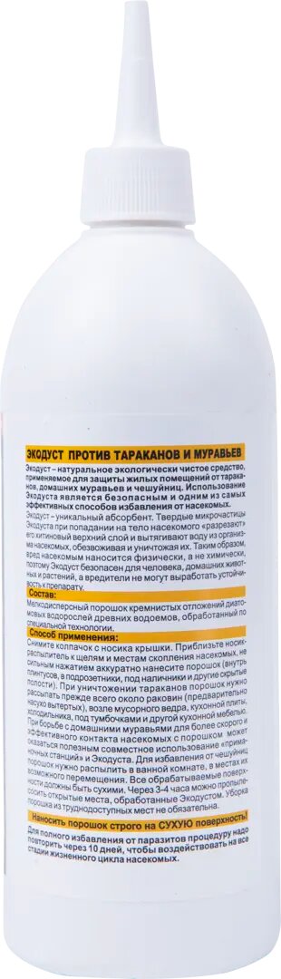«Экодуст» от тараканов и муравьев создан на основе адсорбирующего вещества, вытягивающего влагу из вредителей. Не содержит ядохимикатов или отравляющих веществ. Полностью безвреден для растений, человека или домашних животных. Эффективно уничтожает тараканов и муравьев, исключая возможность адаптации к препарату.