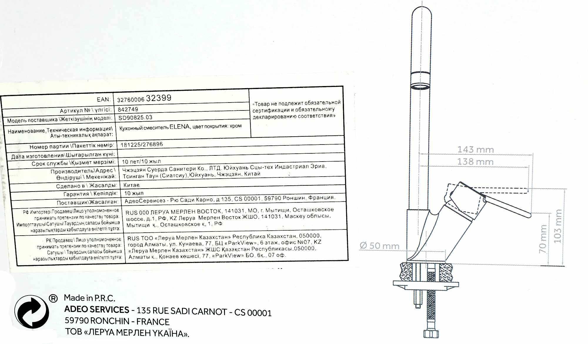 | Состав комплекта | Упаковка, смеситель, гибкая поводка, монтажные элементы, гарантийный талон |