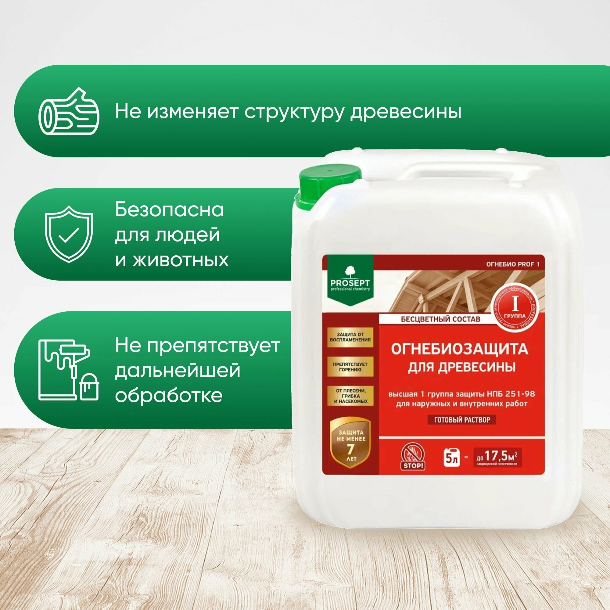 Огнебиозащита Prosept I группа - комплексная огнебиозащитная пропитка для древесины, используемой внутри помещений и на открытом воздухе без прямого воздействия атмосферных осадков и контакта с грунтом. Пропитка защищает древесину от возникновения и распространения огня, а также от воздействия биологических агентов (дереворазрушающие грибки, насекомые и их личинки). Переводит древесину в трудногорючий материал - I (высшая) группа огнезащитной эффективности по НПБ 251-98 и II группа огнезащиты при меньшем расходе - 500 г/м² и 300 г/м² соответственно. Подходит для обработки как новых конструкций, так и конструкций, ранее обработанных огнезащитными составами. Огнебиозащитная пропитка устойчива к старению, не высаливается и не выщелачивается, легко покрывается любыми ЛКМ. Состав не оказывает негативного воздействия на свойства древесины, не изменяет ее структуру, существенно не изменяет естественного цвета древесины (базовая модификация А, модификация Б содержит краситель для контроля нанесения), не препятствует дальнейшей обработке, склеиванию и окраске.