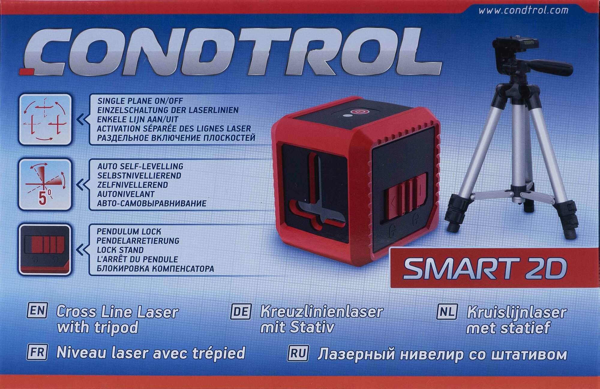 Лазерный нивелир Condtrol Smart 2D предназначен для построения и контроля вертикальных и горизонтальных плоскостей и линий, а также линий и плоскостей с произвольным наклоном. Эксплуатируется в закрытых помещениях. Подходит для подвесного потолка, торцевой планки для перегородки, плитки и обоев. В качестве источника света используется лазерный диод с красным лучом длиной 635 нм.