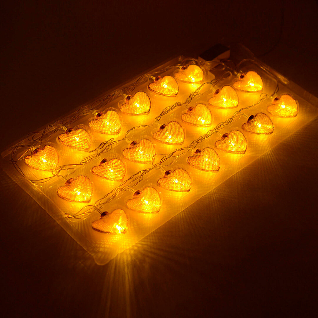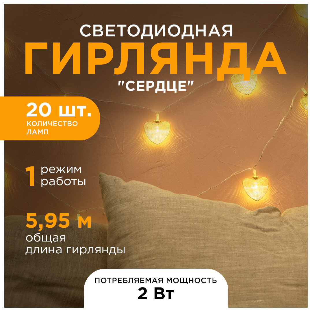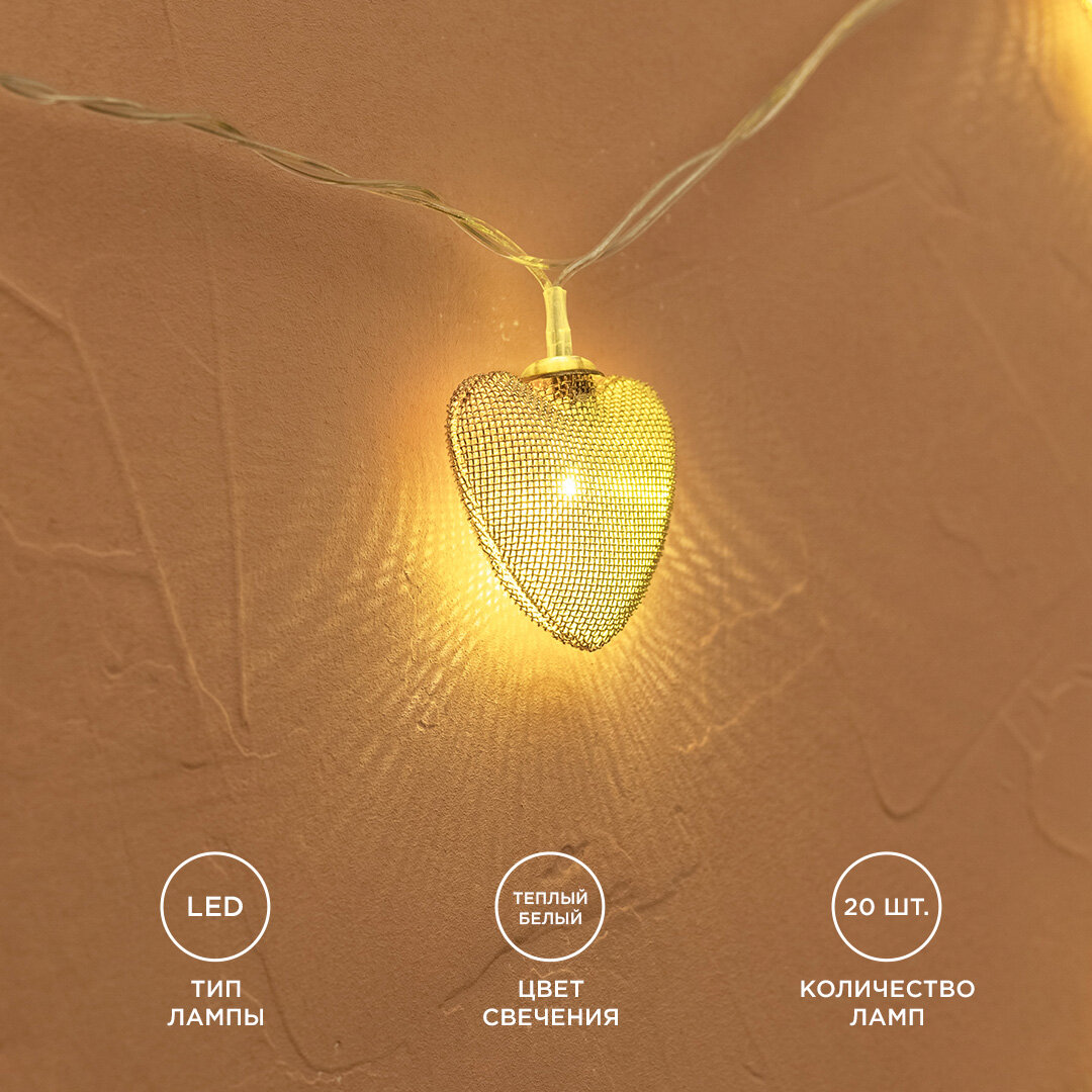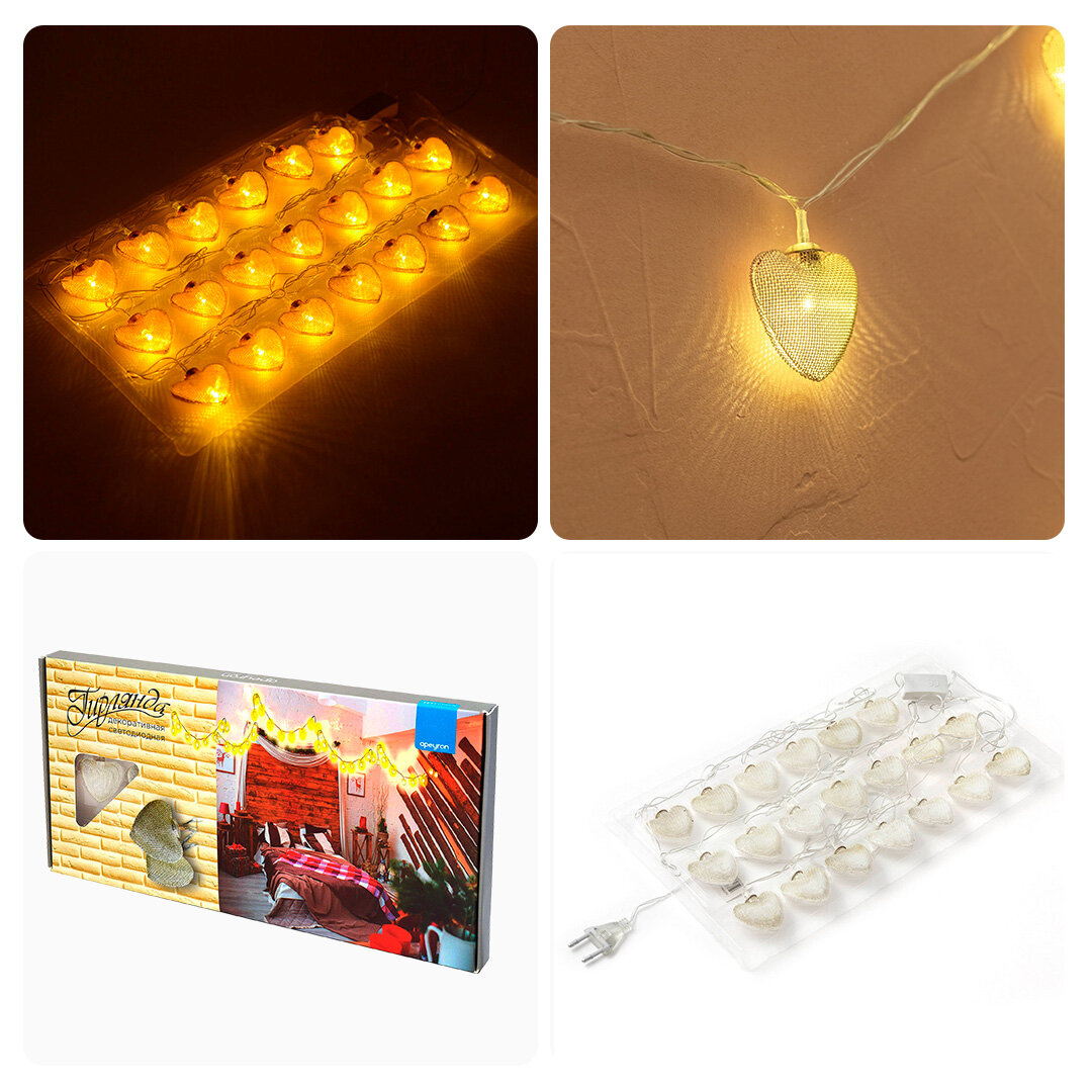 Гирлянда светодиодная «Сердце» — декоративное украшение для дома. Прибор представляет собой провод с закрепленными на нем миниатюрными лампочками (20 шт). Длина кабеля составляет 4 м. Гирлянда работает от сети 220 В. Фонарики выполнены из металла в оттенке «золото». Степень защиты — IP20 (применение в сухих помещениях, защита от твердых частиц размером от 12 мм).