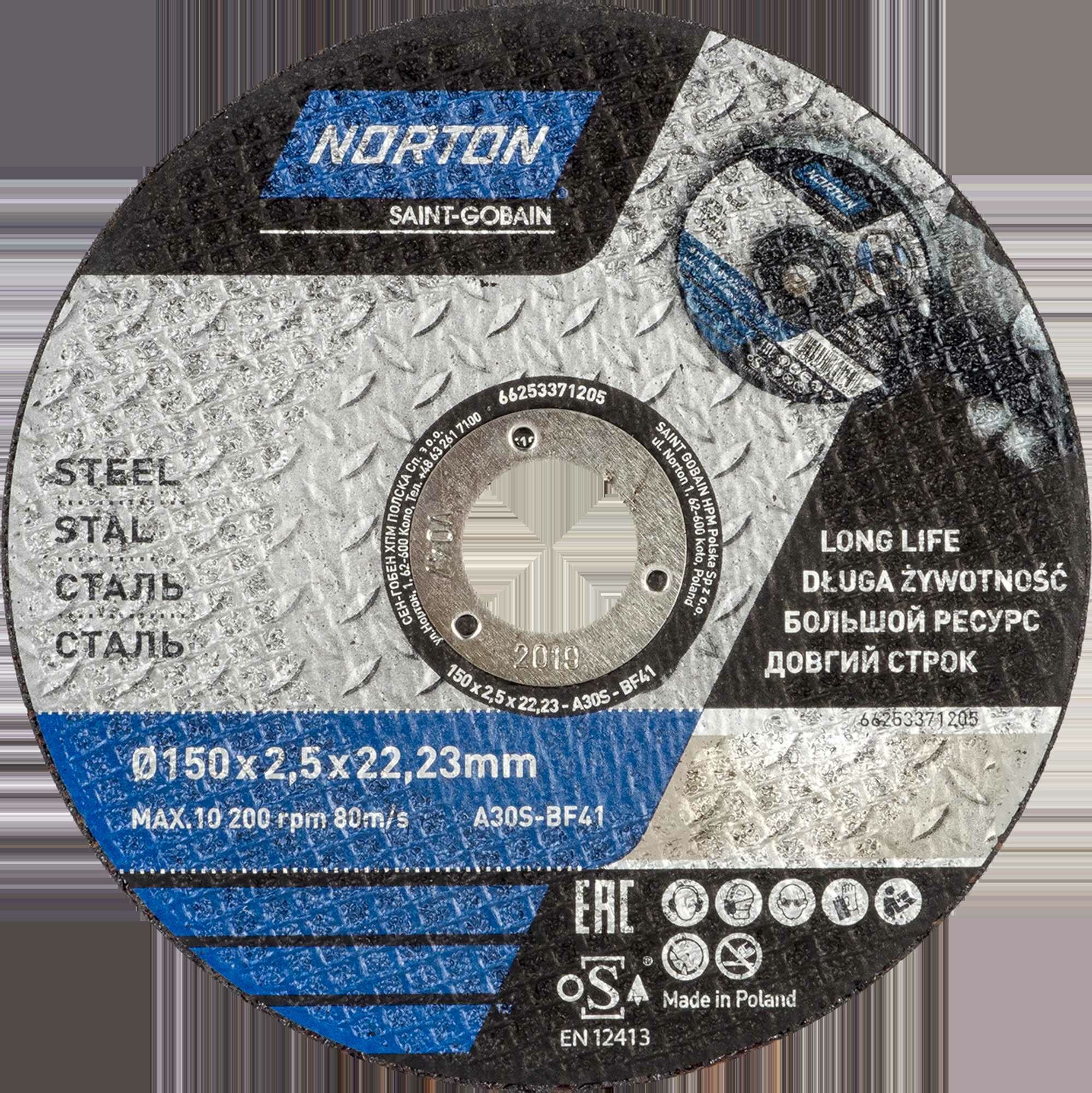 Абразивный круг Norton является расходным материалом польского производства. Предназначен для использования в многофункциональных шлифовальных машинах. Используется для работы по металлу, нержавеющей стали при скорости вращения не более 12 250 об/мин. Посадочный диаметр — 22,2 мм, внешний диаметр — 150 мм. Толщина изделия составляет 2 мм.