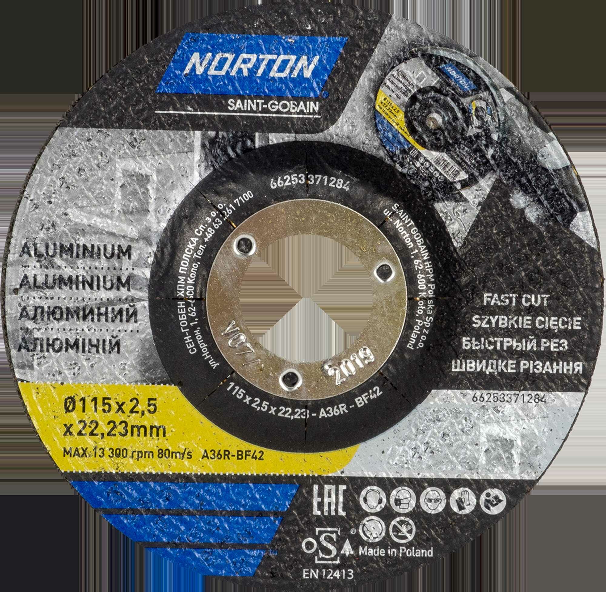 Абразивный круг Norton является расходным материалом польского производства. Предназначен для использования в многофункциональных шлифовальных машинах. Используется для работы по алюминию при скорости вращения не более 12 250 об/мин. Посадочный диаметр — 22,2 мм, внешний диаметр — 115 мм. Толщина изделия составляет 2.5 мм.