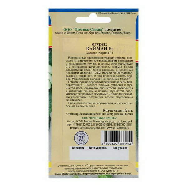 Огурец «Кайман» F1 — раннеспелый гибрид женского типа цветения, не нуждается в опылении. Хорошо переносит переувлажнение, холодостоек, отличается сопротивляемостью к ряду болезней, дает высокий урожай в открытом и защищенном грунте. В узле формируются 2-3 цилиндрических корнишона, вырастающих до 12 см и набирающих массу до 90 г. Плоды универсального использования, темно-зеленые, с небольшими полосками и средними пупырышками, без горчинки.