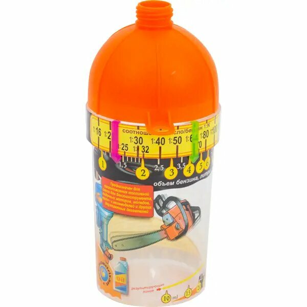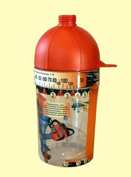 - имеет встроенную шкалу соотношения масло/бензин, что облегчает процесс измерения объема;