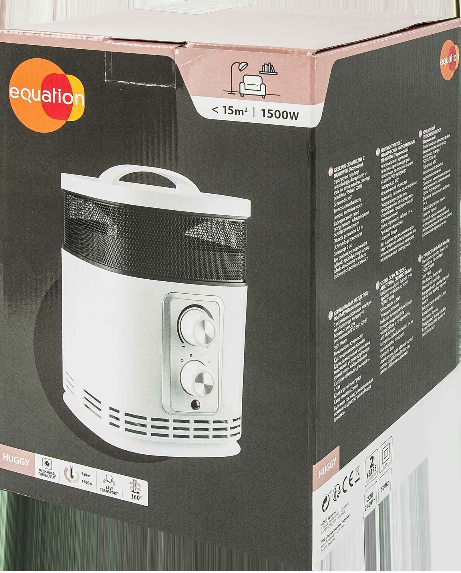 Тепловентилятор керамический Equation 1500 Вт — это компактный мобильный нагревательный прибор, применяемый в качестве дополнительной климатической техники в холодное время года. Предназначен для обогрева жилых и офисных помещений путем потокового разогрева воздуха. В качестве нагревательного элемента используются пористые керамические пластины.