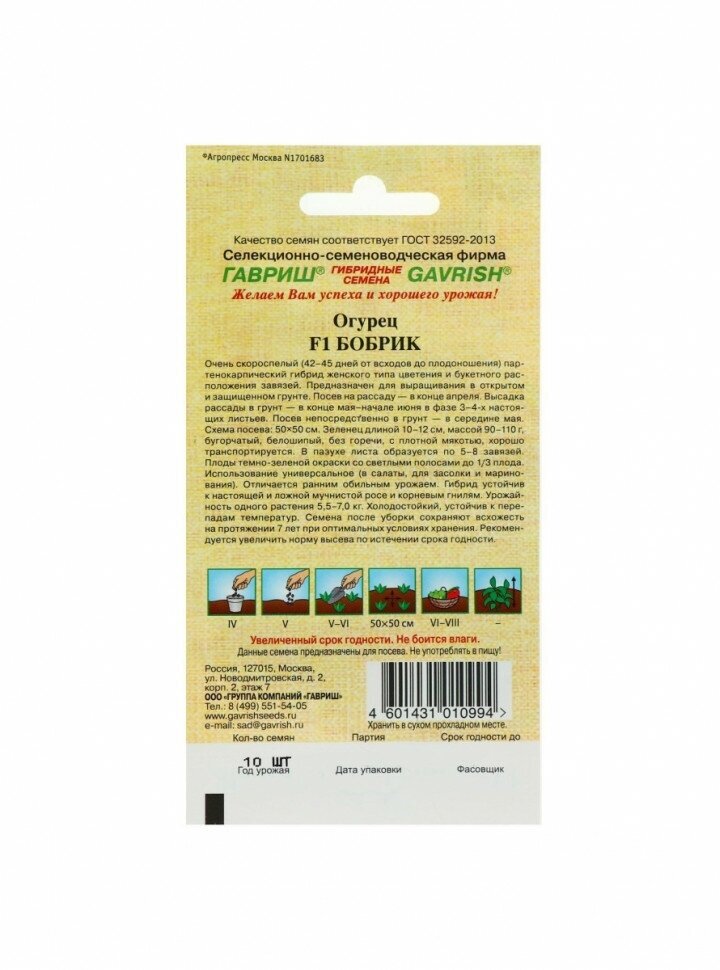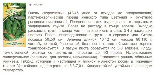 | Инструкция по уходу | Очень скороспелый (42-45 дней от всходов до плодоношения) партенокарпический гибрид женского типа цветения и букетного расположения завязей. Предназначен для выращивания в открытом и защищенном грунте. Посев на рассаду в конце апреля. Высадка рассады в грунт в конце мая – начале июня в фазе 3-4-х настоящих листьев. Посев непосредственно в грунт – в середине мая. |