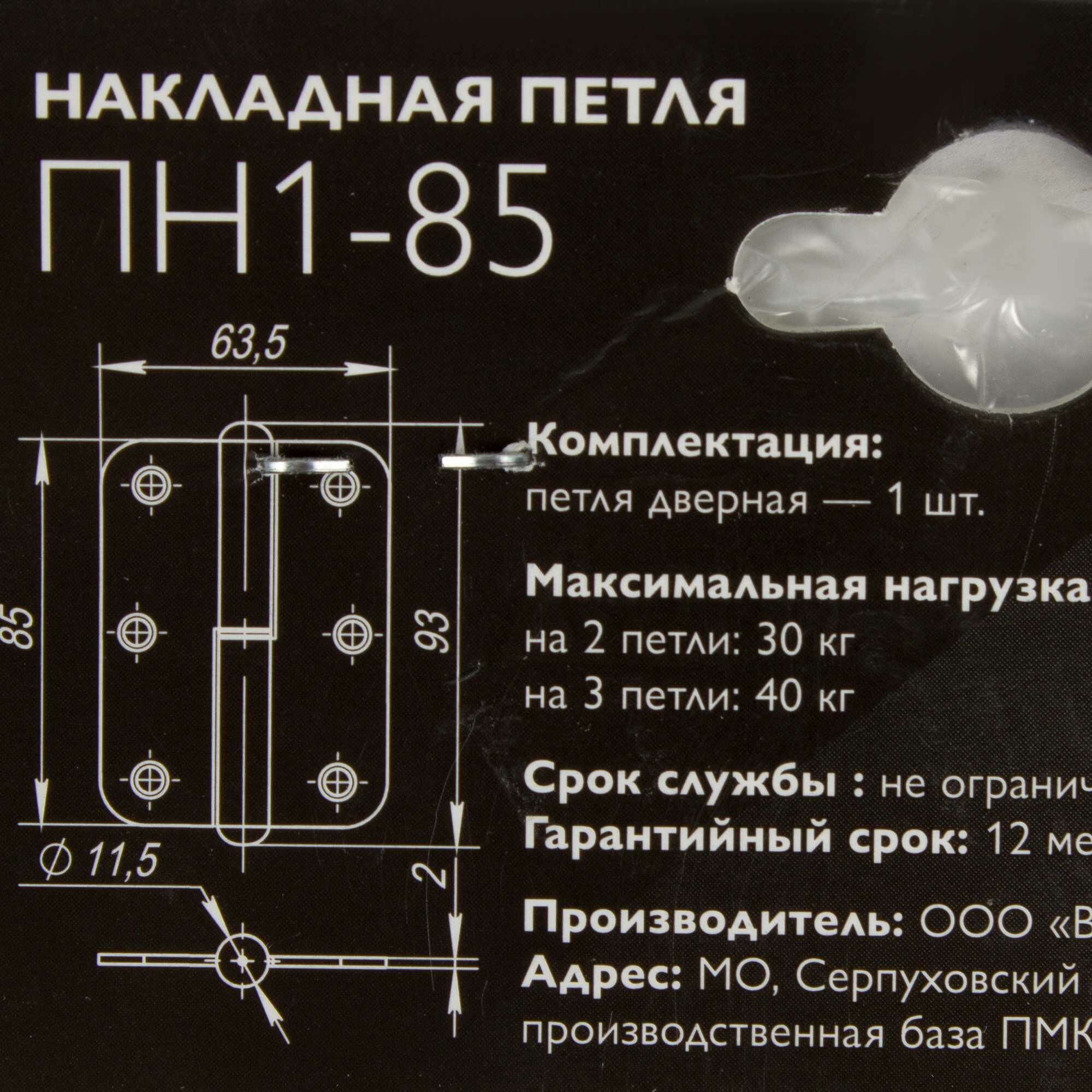 Петля съемная ПН1-85 — крепежный элемент для фиксации деревянной двери в дверной коробке. Изготовлена из нержавеющей стали. Петля прямоугольной формы с винтовым креплением снабжена шарниром невидимого типа и 6 отверстиями для монтажных винтов. Устанавливается врезным способом на дверь с левым открыванием. Длина — 85 мм. Ширина — 65 мм. Внутренний диаметр изделия — 6 мм.