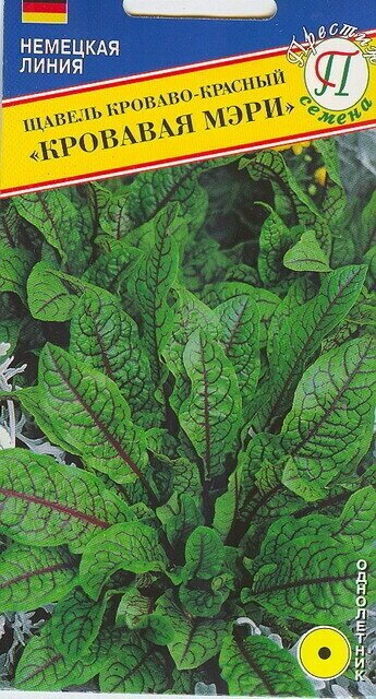 **Щавель «Кровавая Мери»** — многолетнее растение, которое используется в декоративных и пищевых целях. Формирует куст высотой до 40 см. Листья ярко-зеленого цвета дополнены красными прожилками. Поспевает очень быстро. От всходов до срезки проходит всего 40 суток. Подходит для употребления в свежем виде, для добавления в салаты и супы, приготовления гарниров.