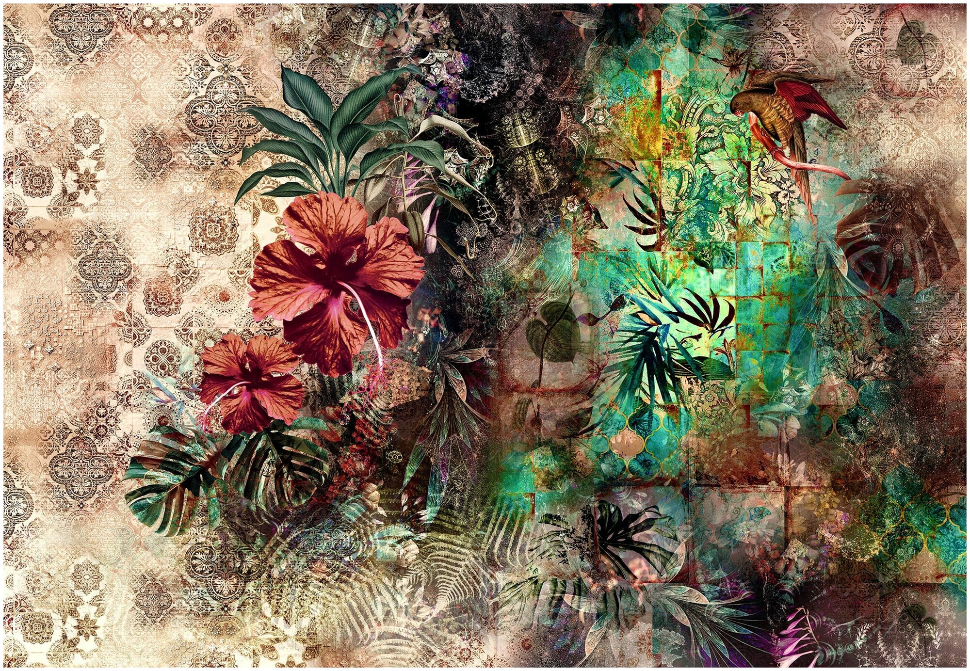 Карибские цветы в сочетании с абстрактными узорами и насыщенными оттенками привносят в жилое пространство дух тропиков. Фотообои "Шехерезада" от Komar. Размер 368 х 254 см.