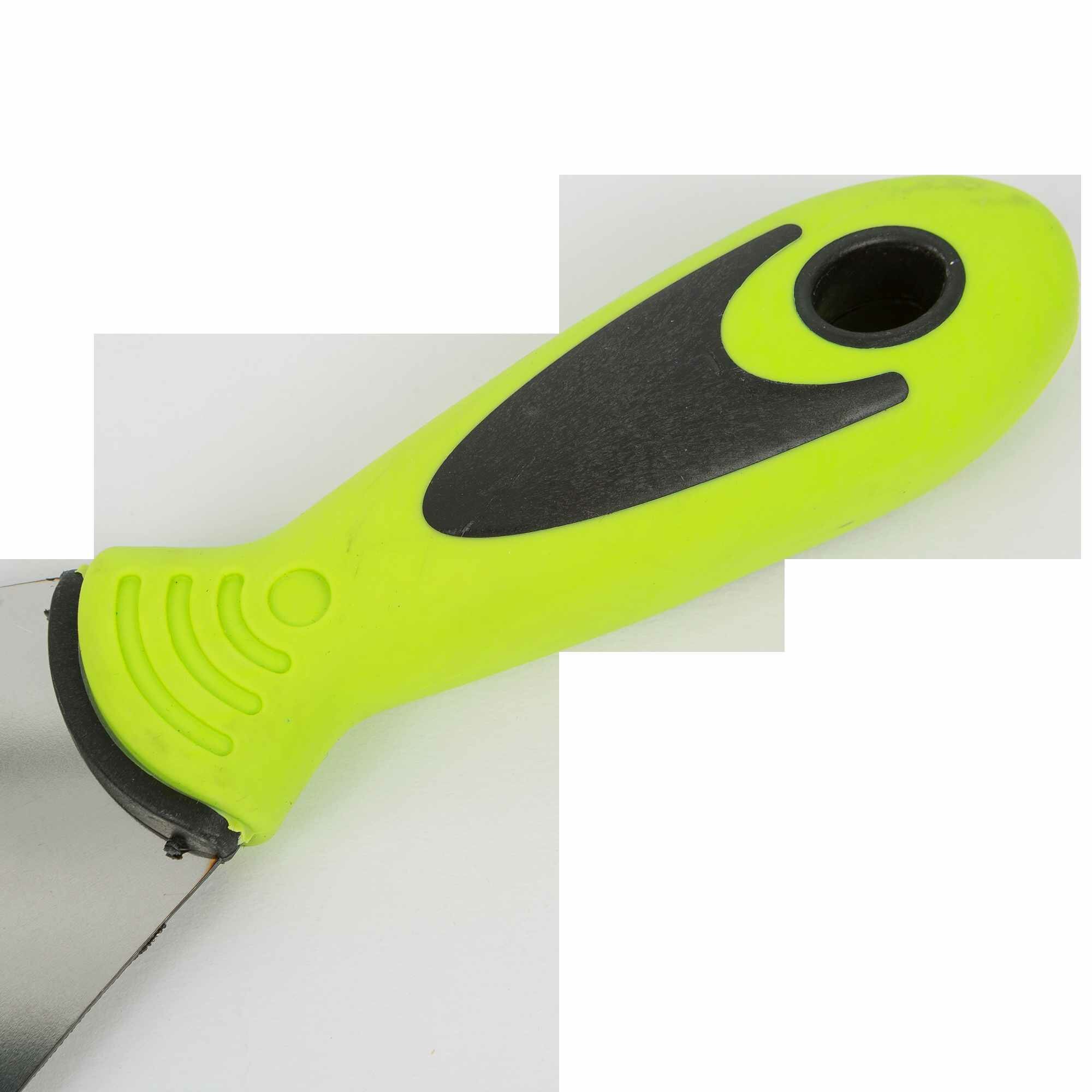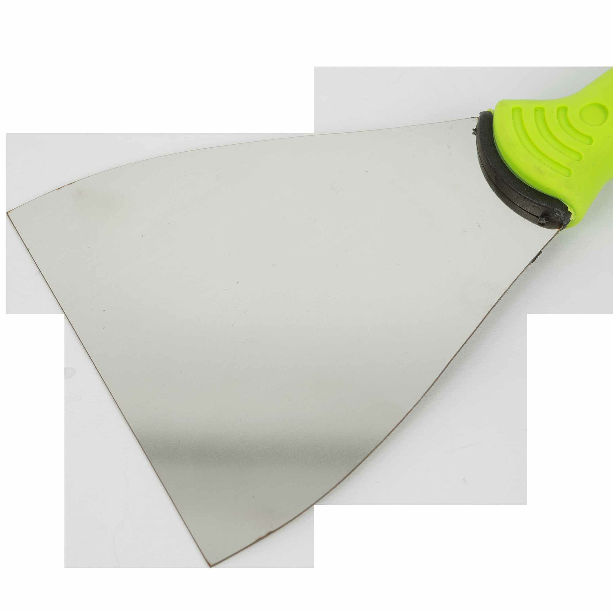 Шпатель представлен трапециевидным лезвием с ровной кромкой и ручкой из двухкомпонентного пластика. Благодаря фактуре материала рукояти шпатель не скользит в ладонях.
