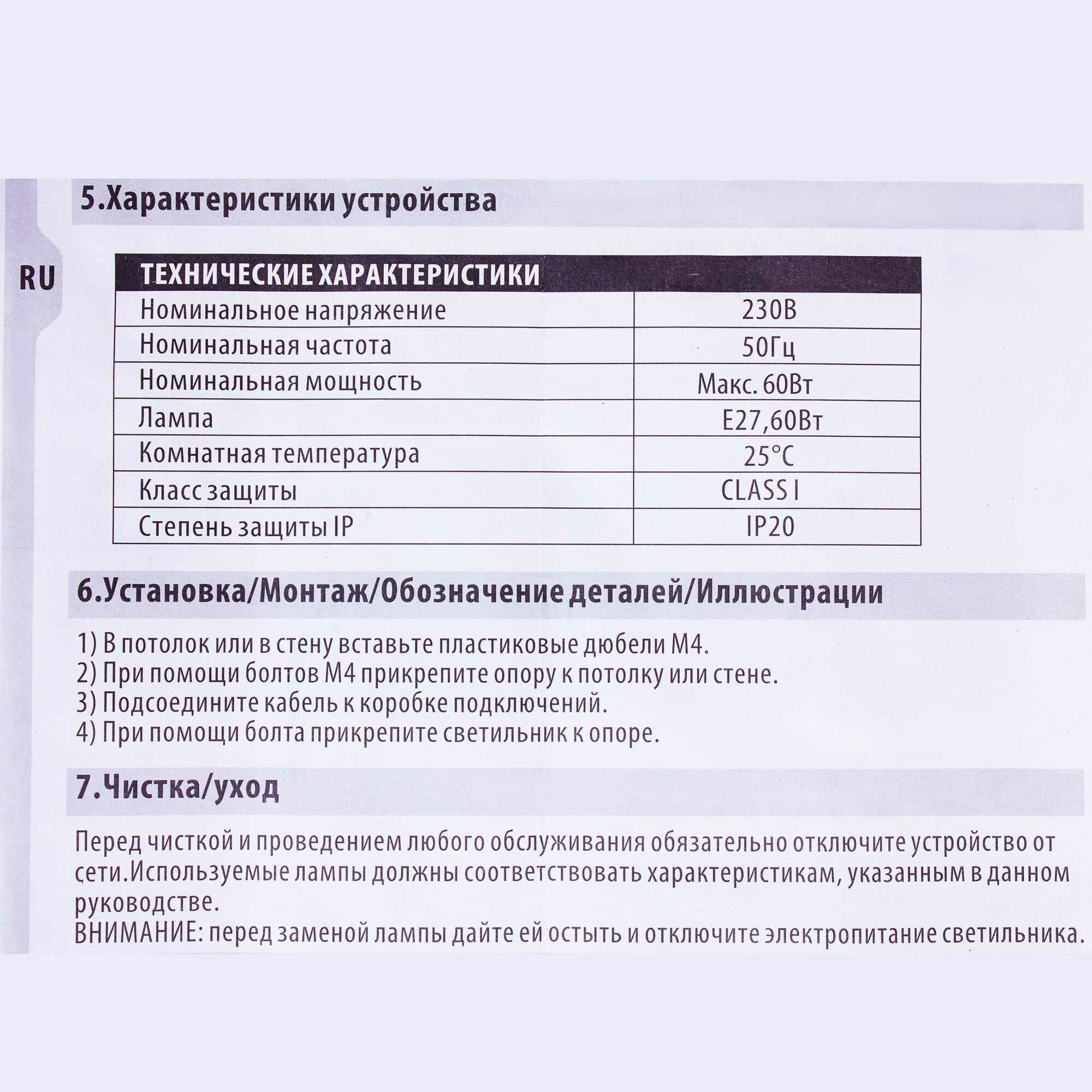 | Максимально допустимая мощность лампы (Вт) | 60 |