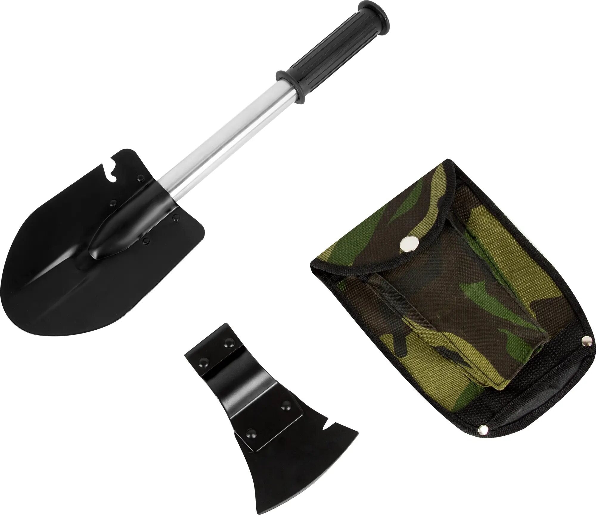 Набор складной «Турист» подойдет для пикников и непродолжительных выездов на природу. В набор входят 4 инструмента, легко заменяемые на единой ручке: саперная лопата, небольшой топор, пила по дереву и нож. Крепление приспособлений на металлической ручке с резиновой рукояткой производится при помощи пружинного фиксатора. Рабочие части инструмента изготовлены из закаленной стали. Комплект поставляется в удобном чехле для хранения и переноски камуфляжной окраски. Производится в Китае. Вес набора составляет 800 г.