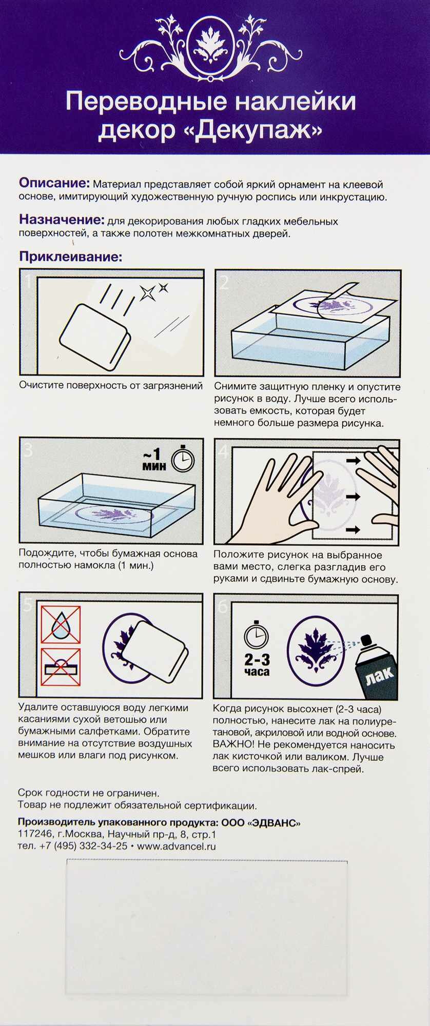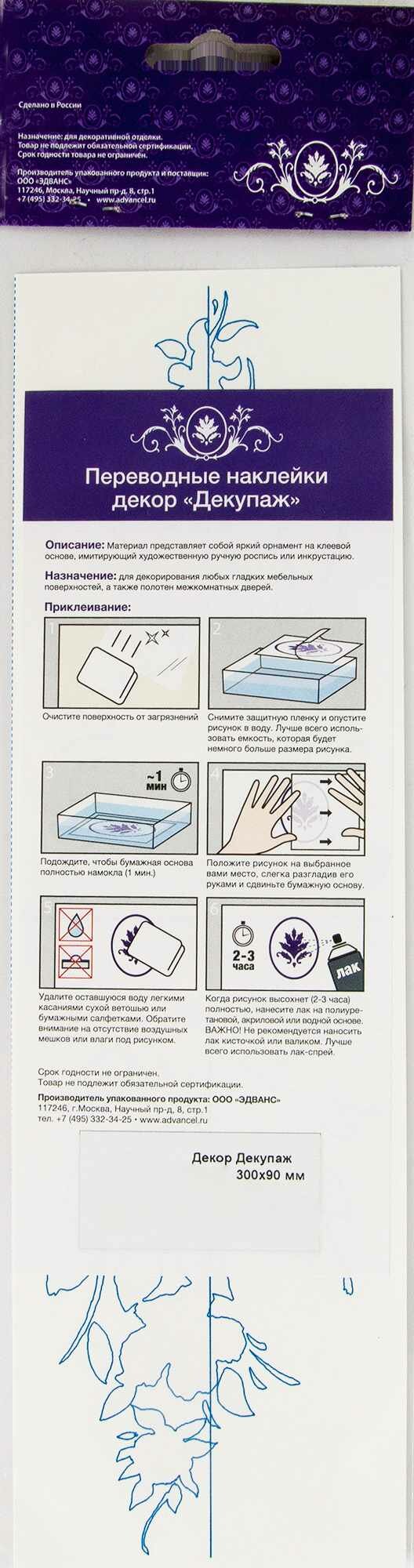 | Применение продукта | Для декорирования мебели, дверей, шкатулок и др.предметов техникой "Декупаж" (иммитация ручной росписи) |