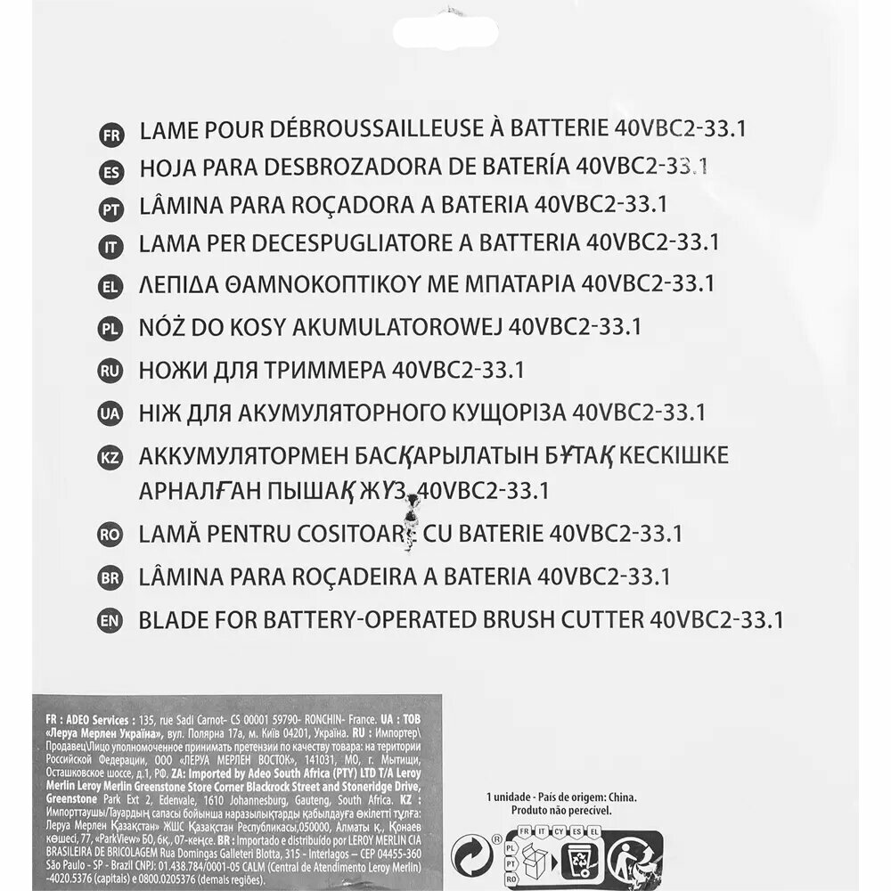 Нож для триммера Sterwins 40VBC2-33.1 предназначен для покоса газонной травы, сорняков и многолетних растений. Насадка изготовлена из стали, имеет четыре лопасти с острой заточкой. Наружный диаметр ножа составляет 230 мм, диаметр посадочного отверстия — 25,4 мм. Максимальная скорость вращения — 10500 об/мин.