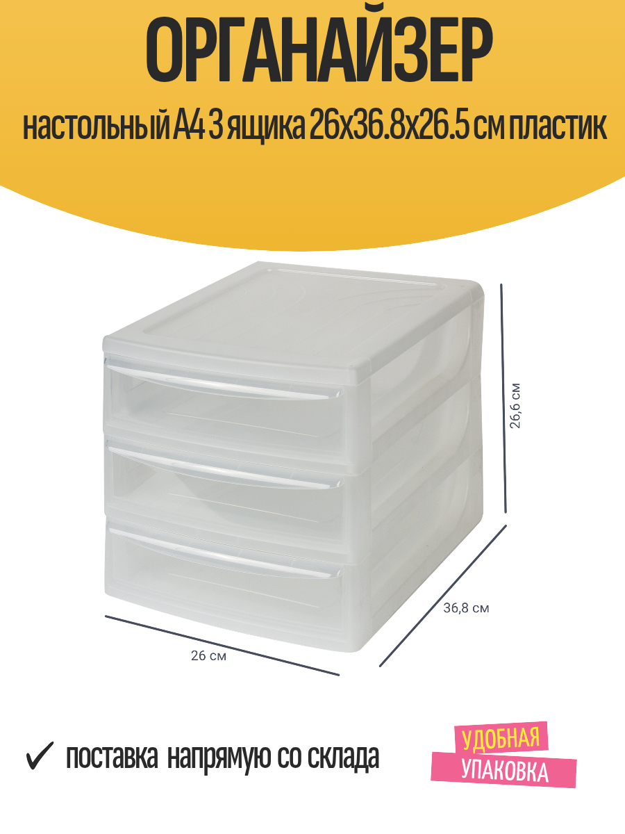 Органайзер настольный A6 пригодится дома, в офисе, в гараже и в мастерской. В 3 прозрачных выдвижных ящиках можно аккуратно разложить бланки и канцтовары, косметику и аксессуары, швейную фурнитуру и принадлежности для рукоделия, насадки для инструментов и крепежи. Это позволит в любой момент быстро находить нужные мелочи. Конструкция не занимает много места: высота изделия 21,4 см, ширина — 17,5 см, глубина — 18,6 см. Корпус и ящики сделаны из прочного полипропилена. Органайзер легко очищается от пыли и грязи и долго служит.