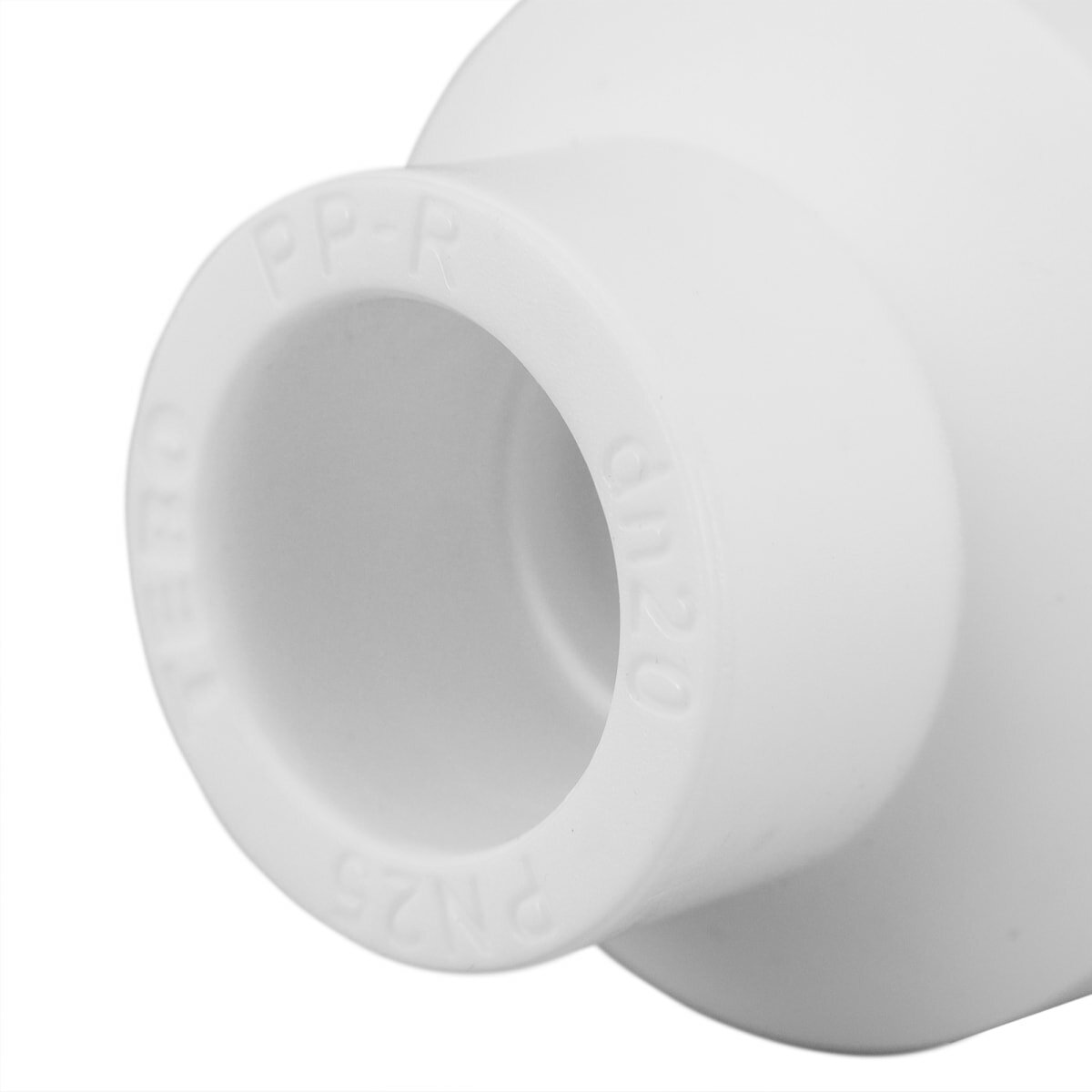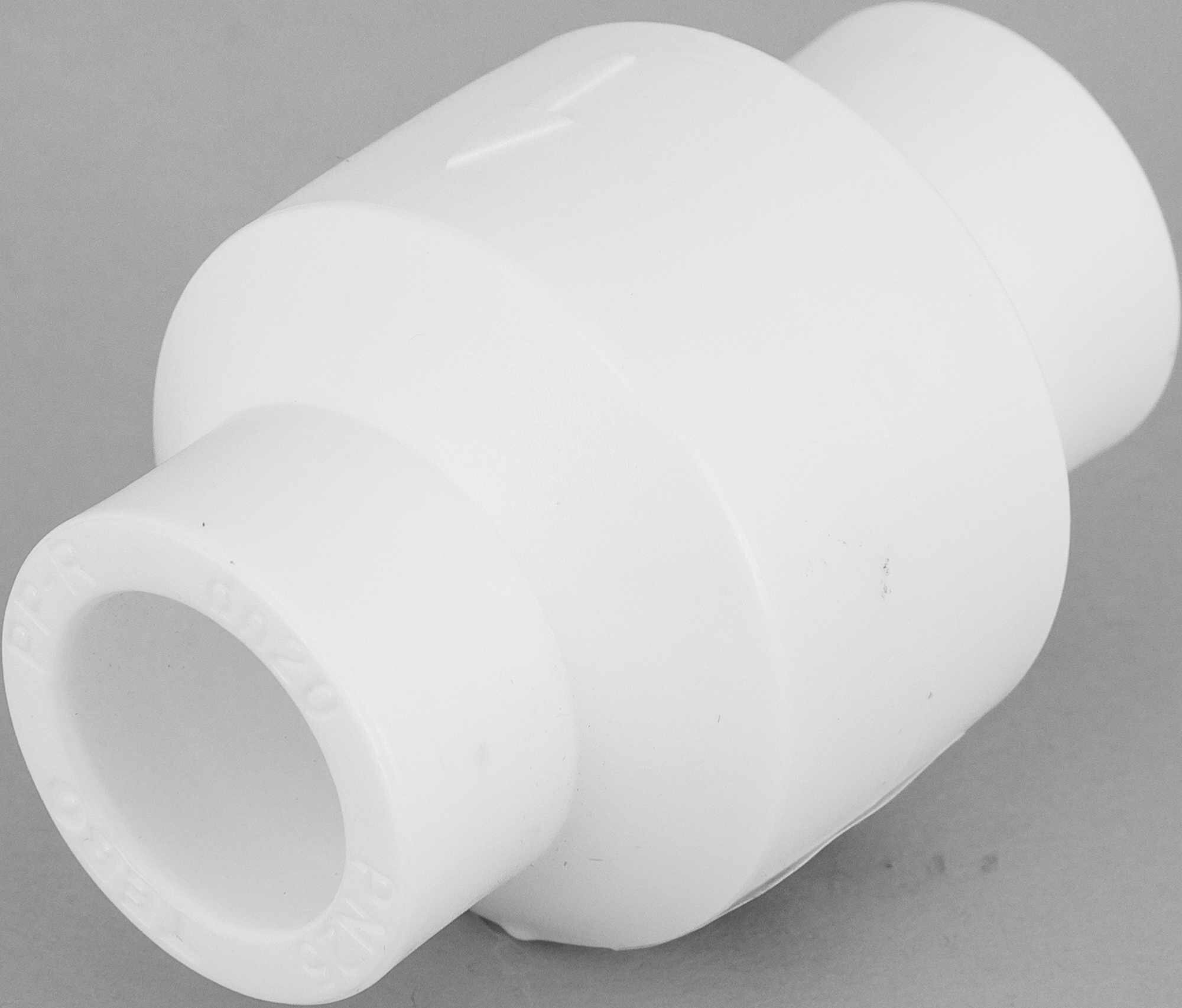 Клапан изготавливается из полипропилена белого цвета. Подходит для трубопроводов с питьевой водой. Выдерживает температуру жидкости до 95 °C.