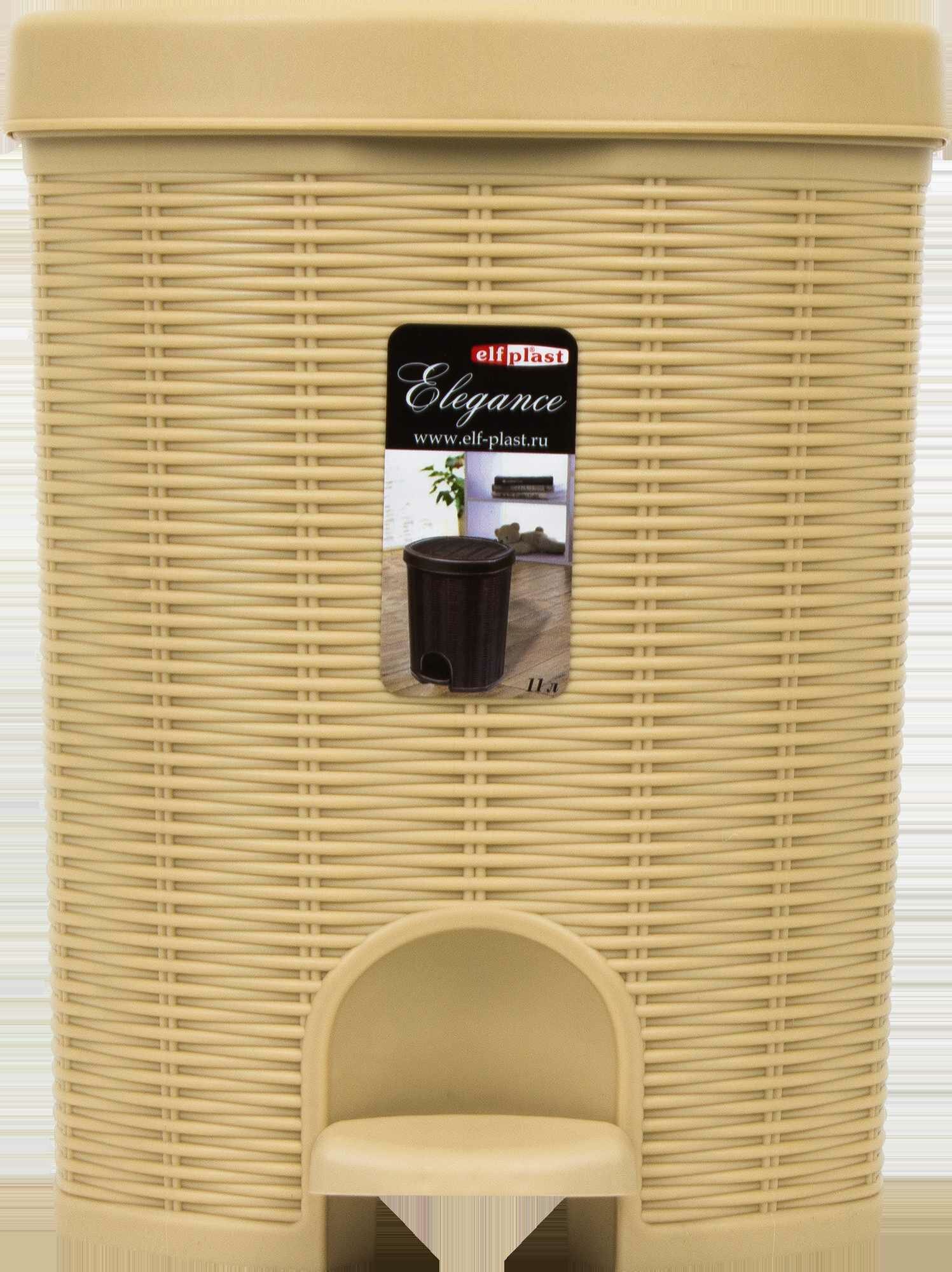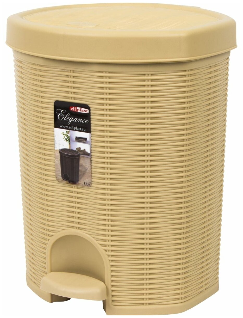 Контейнер для мусора Elegance с педалью и крышкой изготовлен из прочного пластика. Имитирует изящную плетеную корзину из лозы. Бак выполнен в светлом бежевом цвете. Производится в России. Объем контейнера составляет 11 литров.