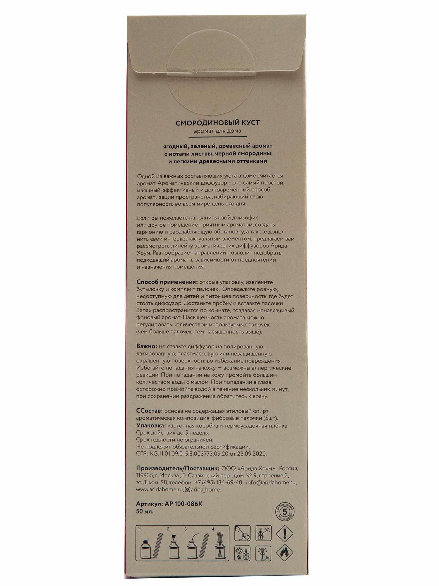 Аромат для дома «Смородиновый куст» — диффузор объемом 50 мл с ротанговыми палочками, который наполнит комнату приятными запахами. Чем больше палочек из набора используется, тем насыщеннее аромат. Также интенсивность запаха можно увеличить, периодически переворачивая палочки. Парфюмерный состав не содержит прекурсоров взрывчатых веществ. Страна производства товара — Россия.