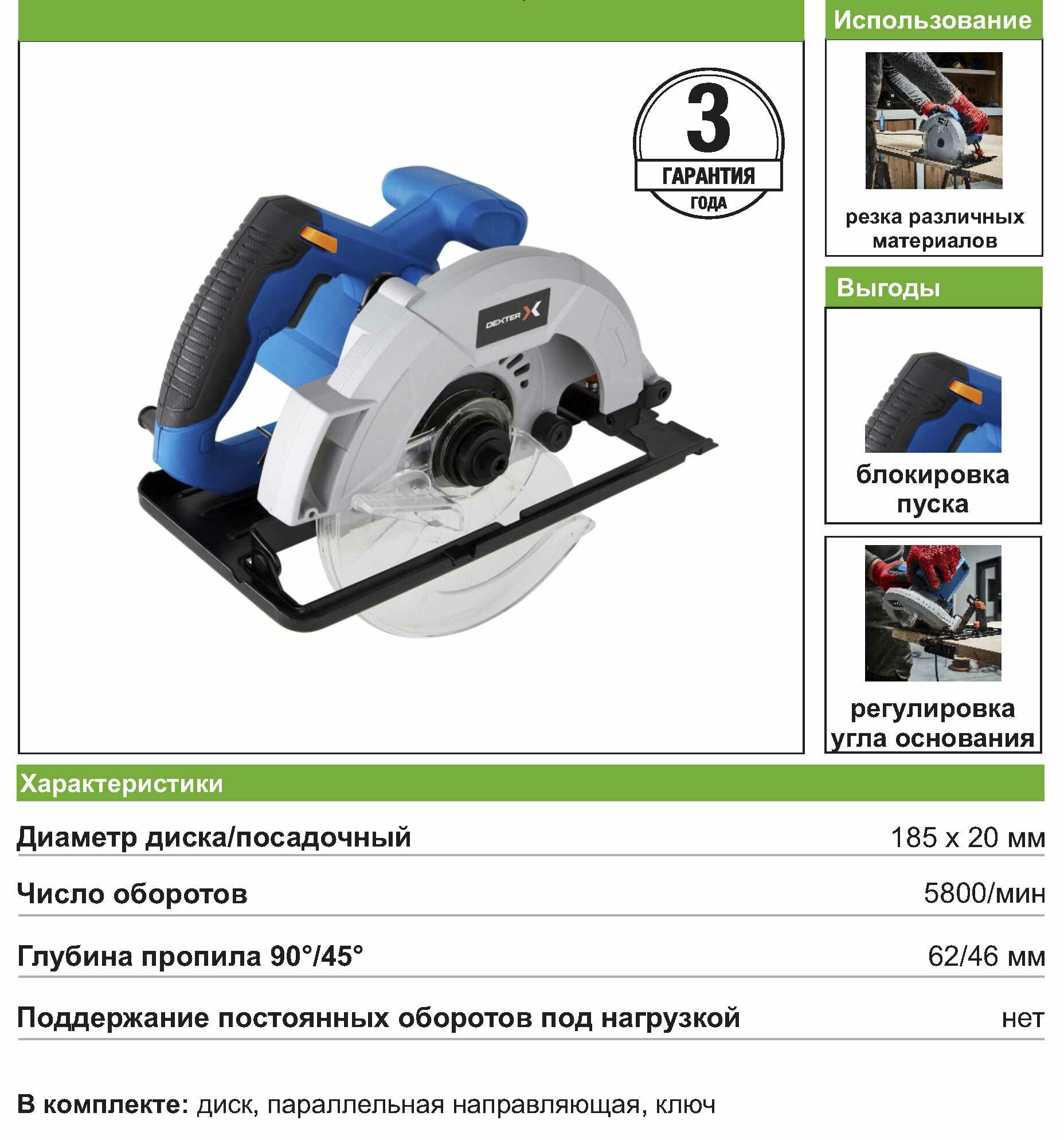 Циркулярная пила Dexter оснащена двигателем мощностью 1300 Вт, развивающим до 5800 об/мин. Рассчитана на работу с дисками размером 185 мм и посадочным диаметром 20 мм. Инструмент способен распиливать древесину толщиной до 62 мм под углом 90° и 46 мм под углом 45°. Подключается к бытовой электросети кабелем длиной 3 м. Гарантия производителя на инструмент — 3 года.