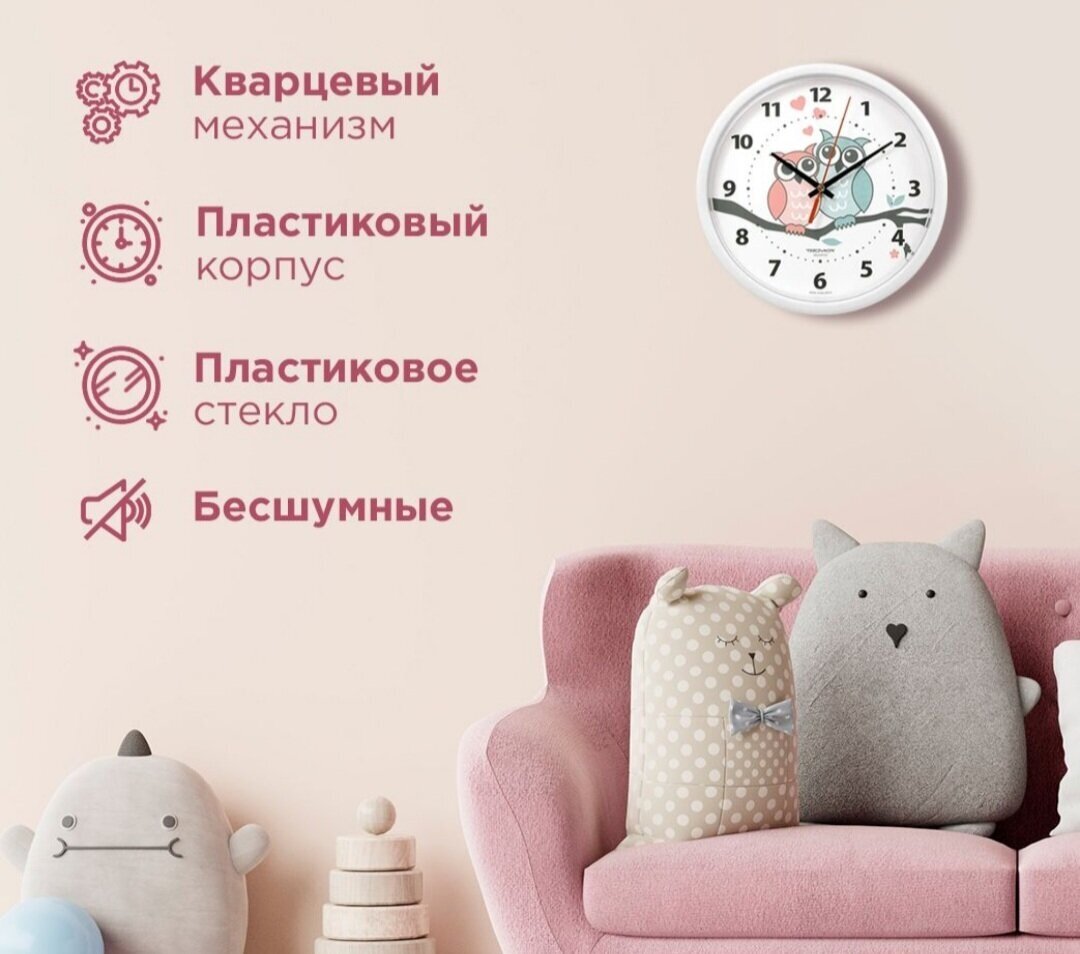 Часы настенные «Совушки» с механическим циферблатом — функциональное украшение жилого помещения, прихожей или коридора. Выполнены в дизайнерском стиле. Корпус белого цвета, изготовленный из пластика, хорошо смотрится в большинстве интерьеров. Высота изделия 23,1 см, ширина — 23,1 см. Элемент питания — 1 батарейка типа «АА» (не входит в комплект). Имеют тихий ход. Страна производства товара — Беларусь.