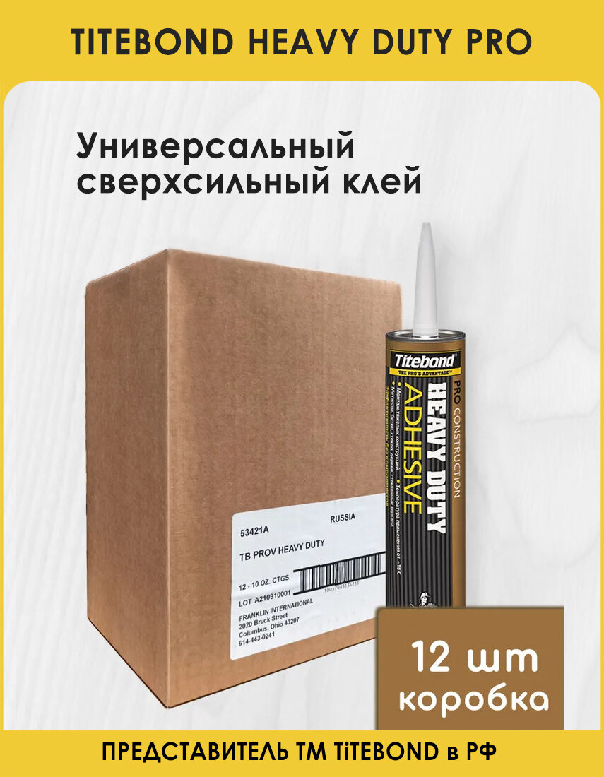 **Клей монтажный Titebond «Heavy Duty Pro»** отличается сверхсильной фиксацией. Предназначен для строительных, ремонтных работ внутри и снаружи помещений. Обеспечивает высокие адгезивные характеристики даже при низких температурах. Изготовлен на каучуковой основе, способен клеить кирпич, мрамор, бетон, пластик, стеклопластик.
