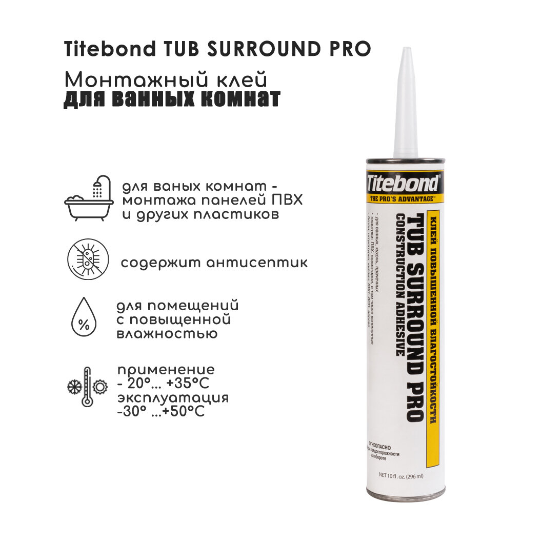 **Клей монтажный Titebond «Tub Surround Adhesive»** отличается сверхсильной фиксацией и влагостойкостью. Предназначен для строительных, ремонтных работ внутри и снаружи помещений. Обеспечивает высокие адгезивные характеристики даже в условиях повышенной влажности. Изготовлен на каучуковой основе, способен клеить кирпич, мрамор, бетон, пластик, стеклопластик.