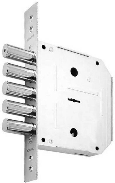 Материал замка и ключей — сталь, антикоррозийная обработка защищает механизм при неблагоприятных условиях эксплуатации, увеличивая срок службы. Лицевая планка в форме прямоугольника аккуратно обрамляет отверстие для ключа. Накладка хромированная. В комплект входит 5 ключей.