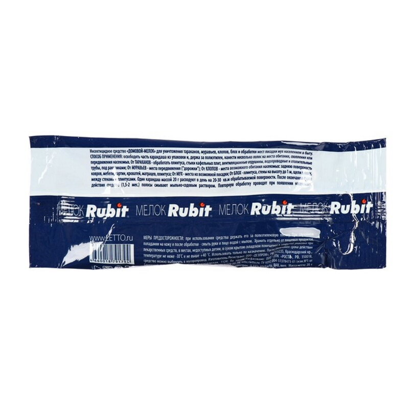 Мелок для защиты от насекомых «Рубит» — бытовое инсектицидное средство для уничтожения ползающих насекомых и отпугивания мух в помещении. Наносится на все поверхности в местах присутствия насекомых, их передвижения или возможного появления: полы и стены, плинтуса, мебель, трубы, стыки отделочных материалов. Мелок эффективен в борьбе с тараканами, муравьями, клопами и блохами. Упаковка рассчитана на обработку площади до 30 м².
