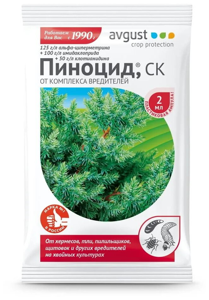 Средство для защиты хвойных растений от вредителей «Пиноцид» оказывает комплексное действие. Препарат эффективен в борьбе со щитовками, тлей, хермесами и другими распространенными вредителями. Перед использованием 2 мл (одну ампулу) инсектицида нужно растворить в 10 л воды. Срок защиты — до 14 дней.