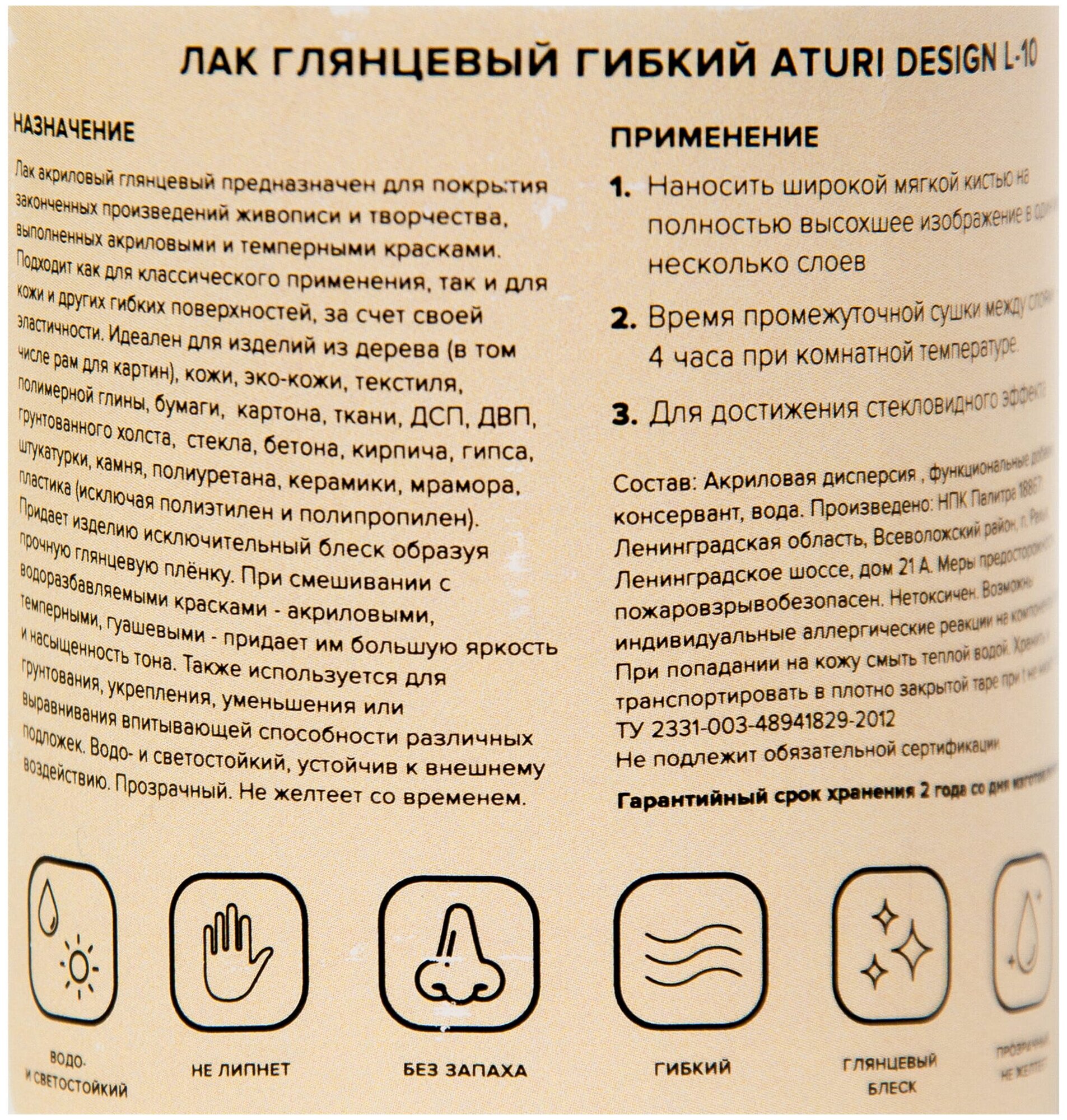 Лак акриловый Aturi (Россия) — прозрачная жидкость без ярко выраженного запаха, нетоксичная. Создает защитный слой на поверхности картин, сувениров ручной работы, поделок и прочих образцов творчества, покрытых акриловыми или темперными красками.