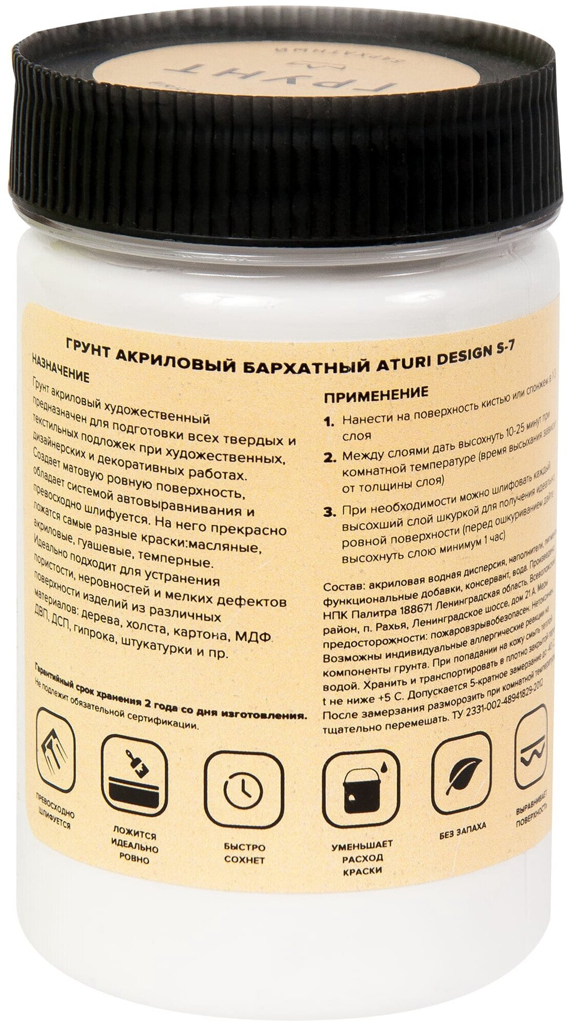 Грунт акриловый Aturi Design предназначен для подготовки текстильных и твердых оснований к художественным и дизайнерским работам. Снижает впитываемость материалов, выравнивает поверхности. Образует белое матовое покрытие, на которое прекрасно ложатся масляные, акриловые и темперные краски, гуаши. Подходит для обработки бумаги и картона, дерева и древесных материалов, холста, штукатурки.