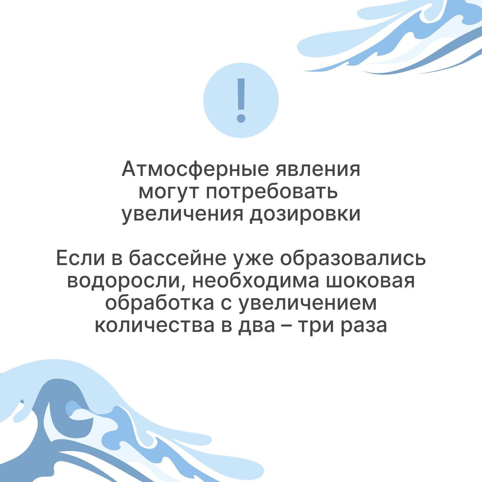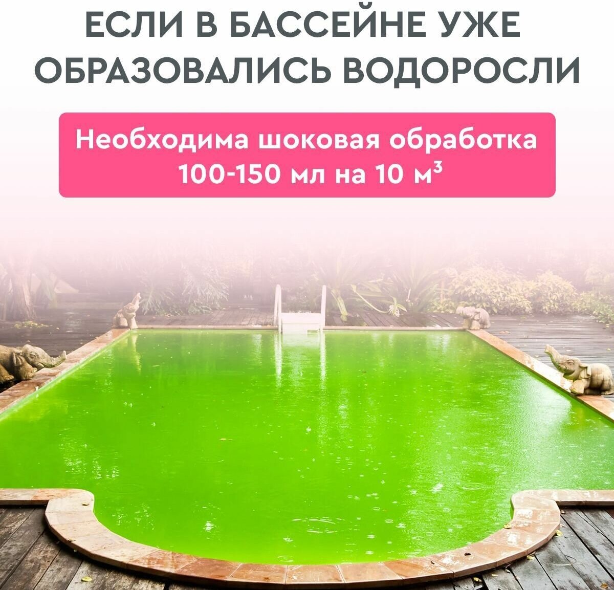 Крытые и уличные бассейны – идеальное место для размножения колоний микроорганизмов. На стенках появляется зеленый налет, вода становится зеленоватой и приобретает неприятный запах. Чтобы предотвратить «цветение» воды и скопление водорослей на стенках и дне чаши, необходимо использовать данный эффективный альгицид.