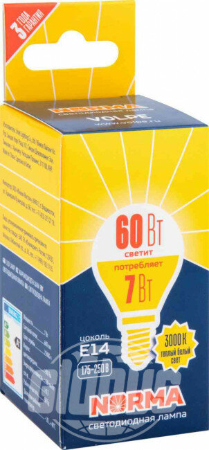 Лампа Volpe Norma светодиодная выполнена в форме малого шара диаметром 45 мм. Предназначается для организации основного и дополнительного освещения. Светит теплым белым светом (4000 K). Рассчитана на подключение к сети с напряжением 170-240 В, потребляемая мощность — 7 Вт, цоколь Е14. Световой поток — 370 лм (норма освещенности на м² помещения — 150-200 лм).