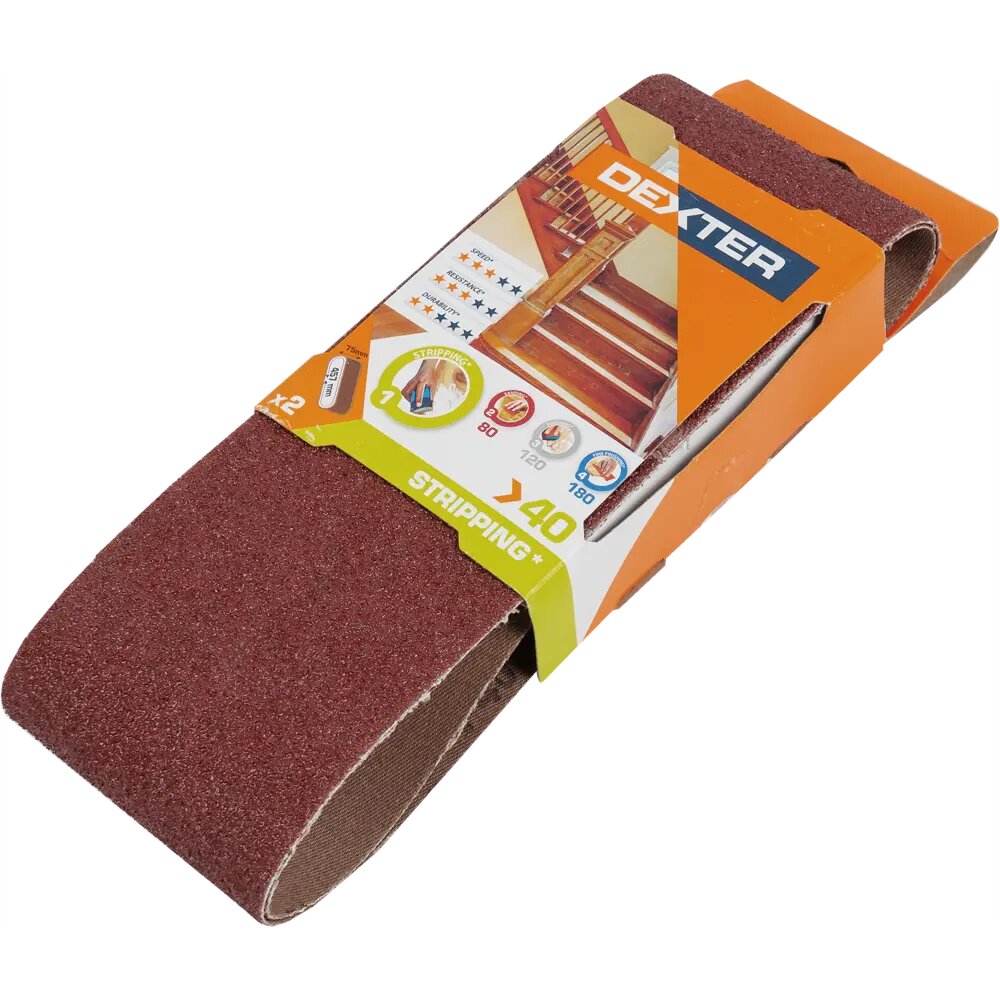 Лента Dexter размером 75 × 457 мм предназначена для использования в ленточных шлифовальных машинах. Имеет зернистость Р40. Скорость использования, устойчивость и прочность средняя. Бесконечная лента может применяться также при ручной обработке материала. В комплекте 2 шт.