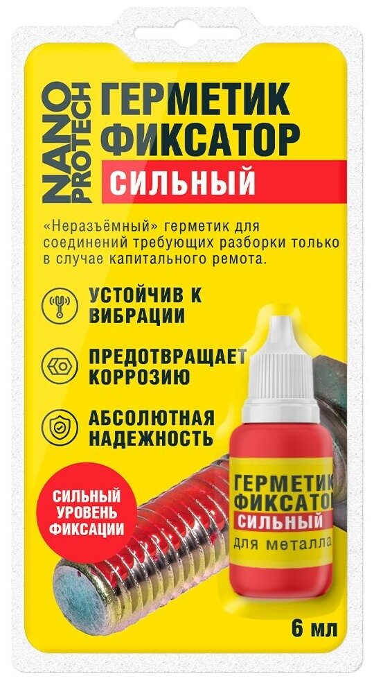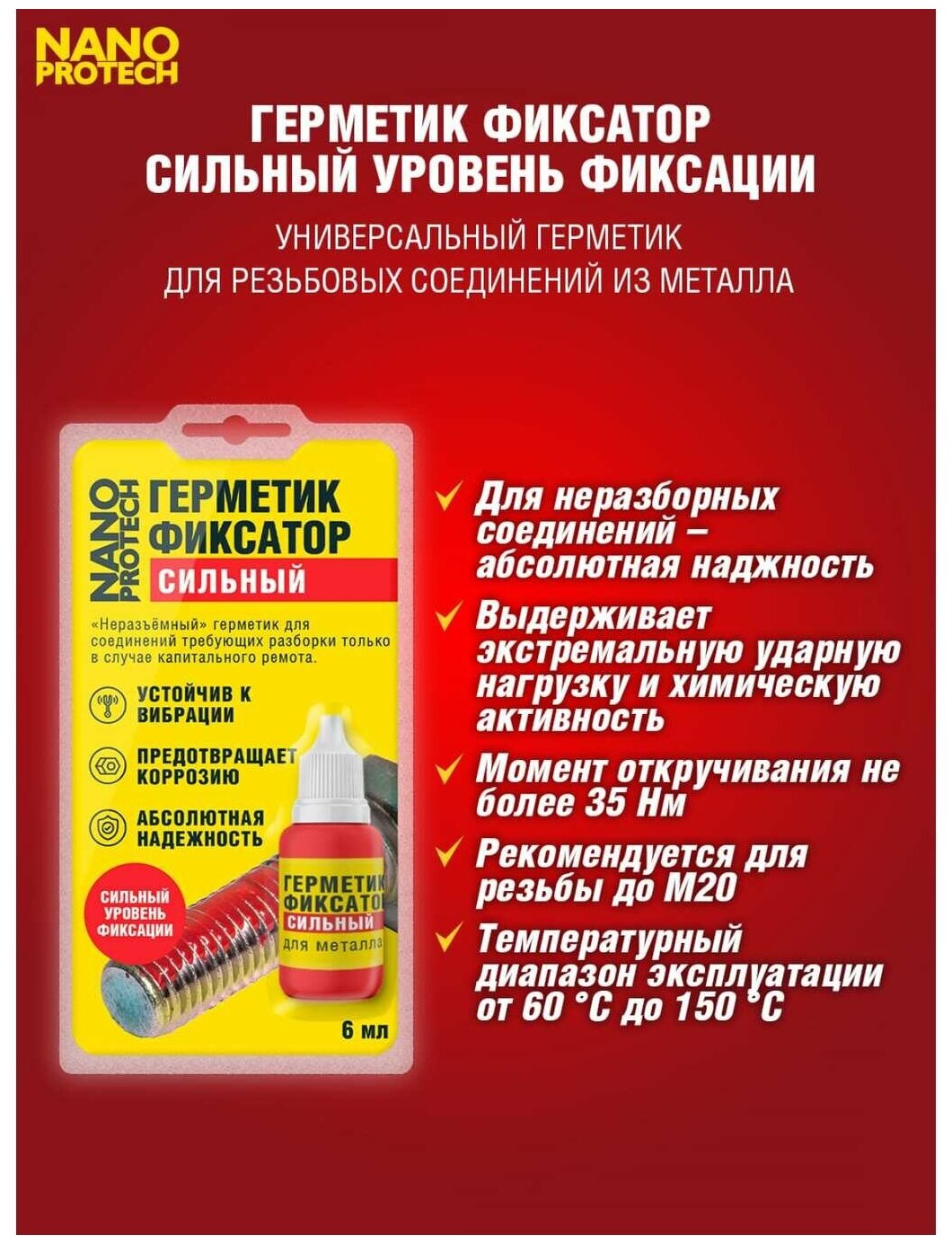 Фиксатор резьбы неразъёмный Nanoprotech — универсальный герметизирующий состав для фиксации резьбовых соединений, которым потребуется разборка только в случае капитального ремонта. Полностью застывает за 20 минут. Состав повышает прочность и надежность участка, дополнительно герметизирует его. Предотвращает ржавление крепежа, увеличивает устойчивость соединения к вибрациям, нагрузкам и воздействию агрессивных сред. Диапазон температур применения — от -60 до +150 °С. Фиксатор представлен в удобном прозрачном тюбике емкостью 6 мл.