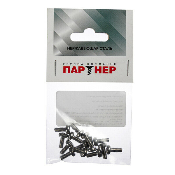 Винт изготовлен из нержавеющей стали без покрытия. Длина изделия составляет 1 см, диаметр — 4 мм. Количество метизов в наборе — 14 шт.