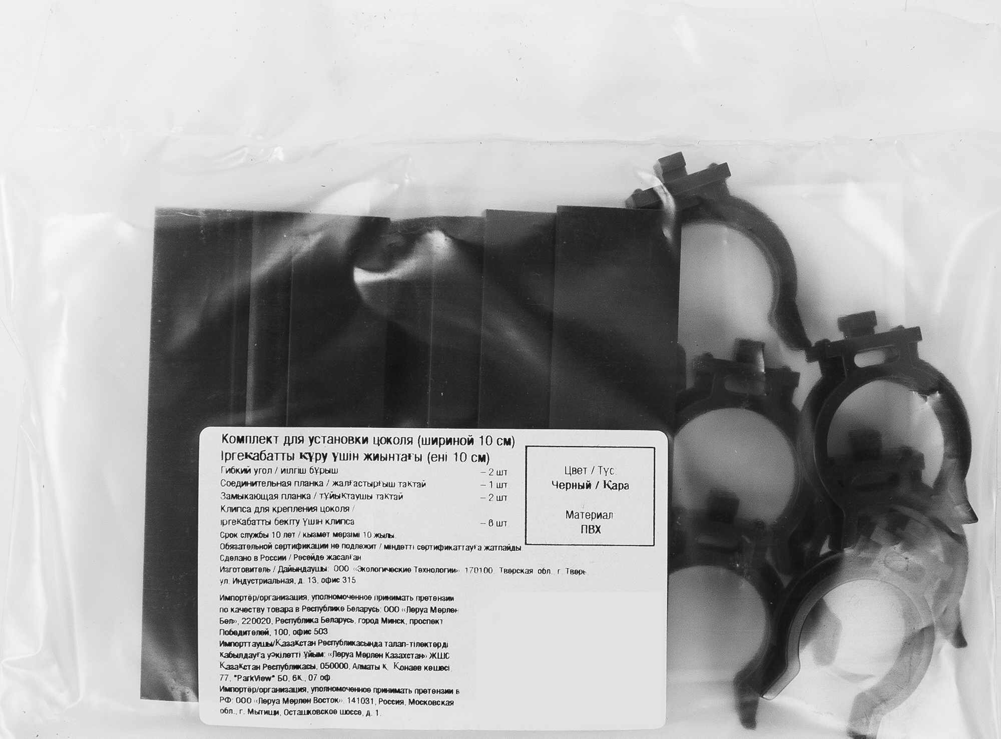 Комплект для установки кухонного цоколя — это набор крепежных элементов и соединителей для проведения скользящего монтажа ПВХ-цоколя шириной 10 см (цвет — чёрный). Комплект содержит 2 гибких уголка, соединительную планку, 2 замыкающих планки и 6 черных клипс для скрытого крепления за мебельные ножки. Набор упакован в пакет, материал изготовления всех элементов — ПВХ. Срок службы — 10 лет. Страна производства — Россия.