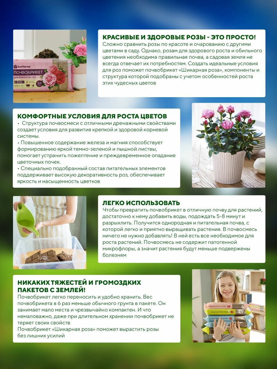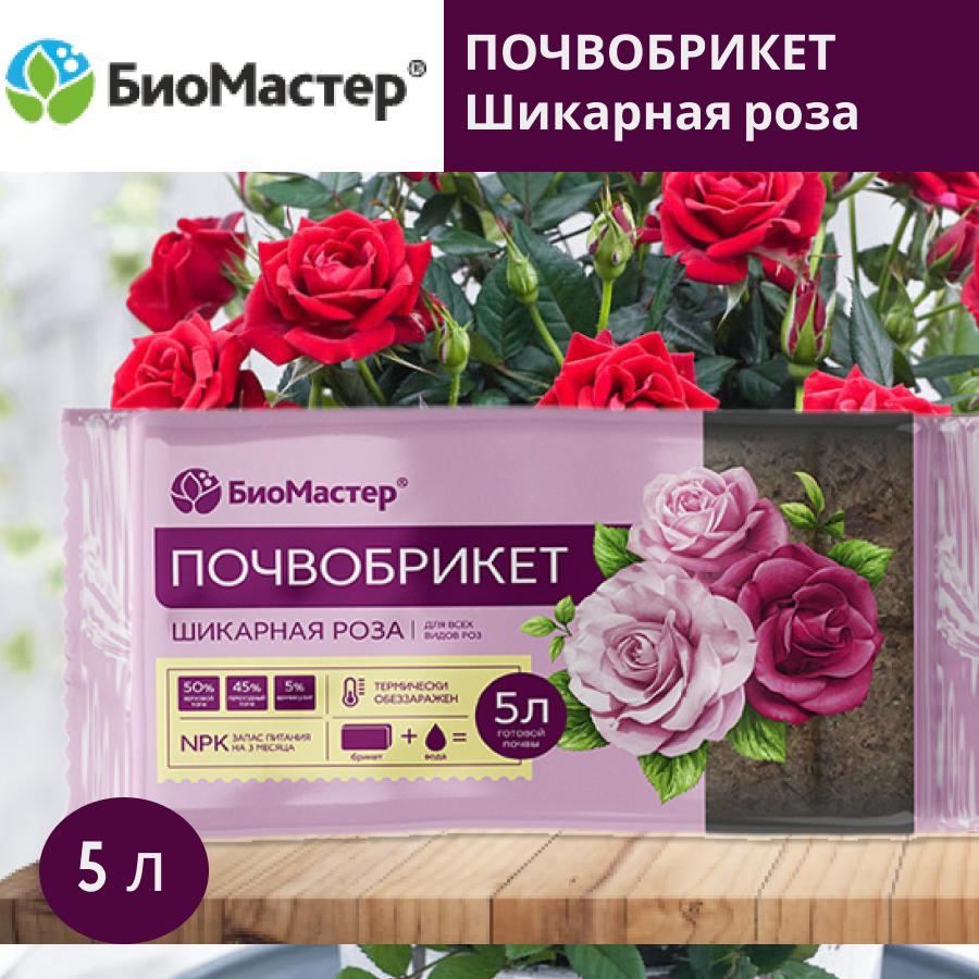Почвобрикет «БиоМастер» «Шикарная Роза» — плодородная спрессованная почва, включающая верховой (50%) и переходный (45%) торф с добавлением вермикулита, содержит 3-месячный запас питательных элементов. Предназначен для всех видов роз, а также представителей семейства астровых (хризантем), аралиевых (плющей) и других. Оптимальный баланс всех компонентов обеспечивает гармоничное развитие растений и высокую декоративность. Брикет дает 5 л готового грунта.