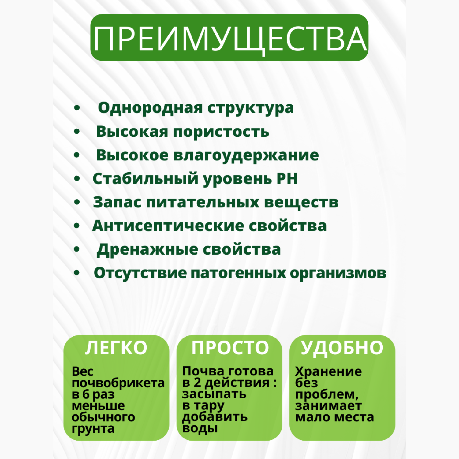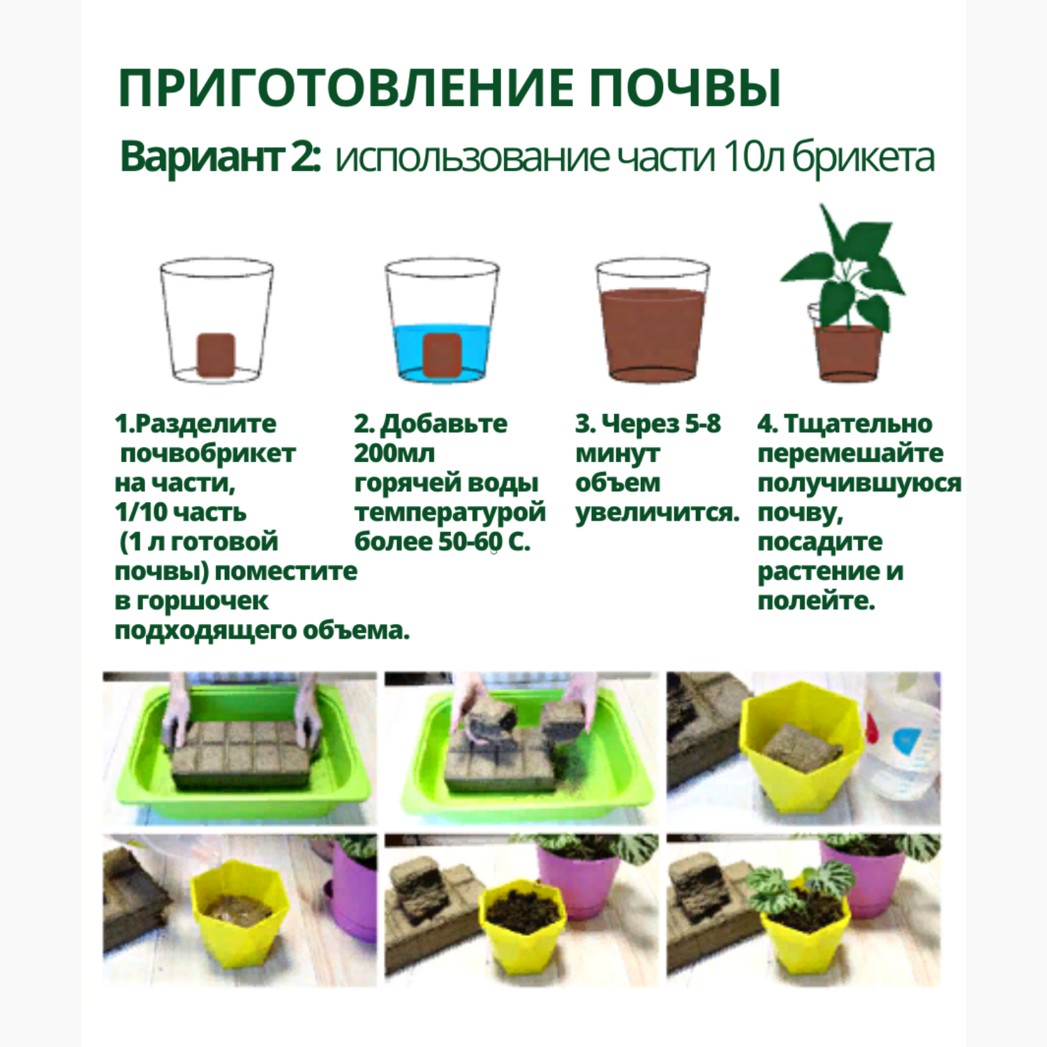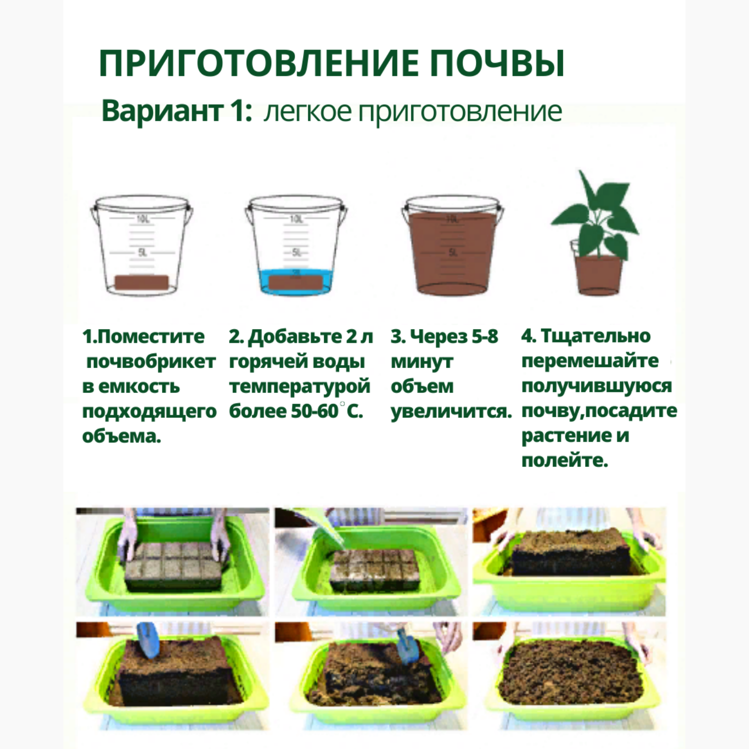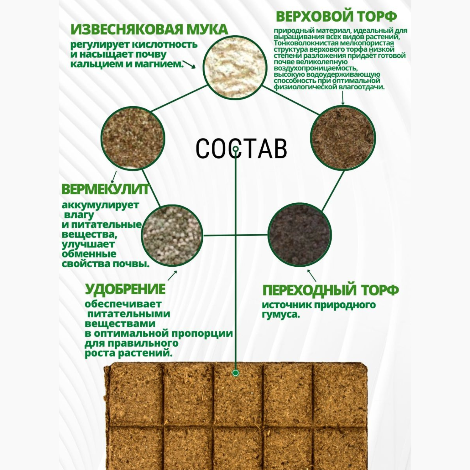 | Состав | Верховой торф -60%, переходный торф -35%, вермикулит- 5%, удобрение. |