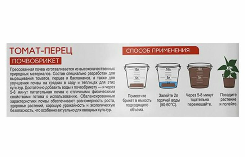 Почвобрикет разводится теплой водой из расчета 4 л воды на одну упаковку. В результате получается 10 л смеси, готовой к использованию. Произведено в России.