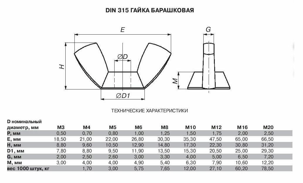 Гайка барашковая DIN 315 (т.н. «барашек») имеет плоские лепестки («ушки»), выступающие вверх, за которые изделие можно закрутить и открутить вручную, без ключа. Используется в мебельном производстве, в строительстве, в машино- и приборостроении и других областях.