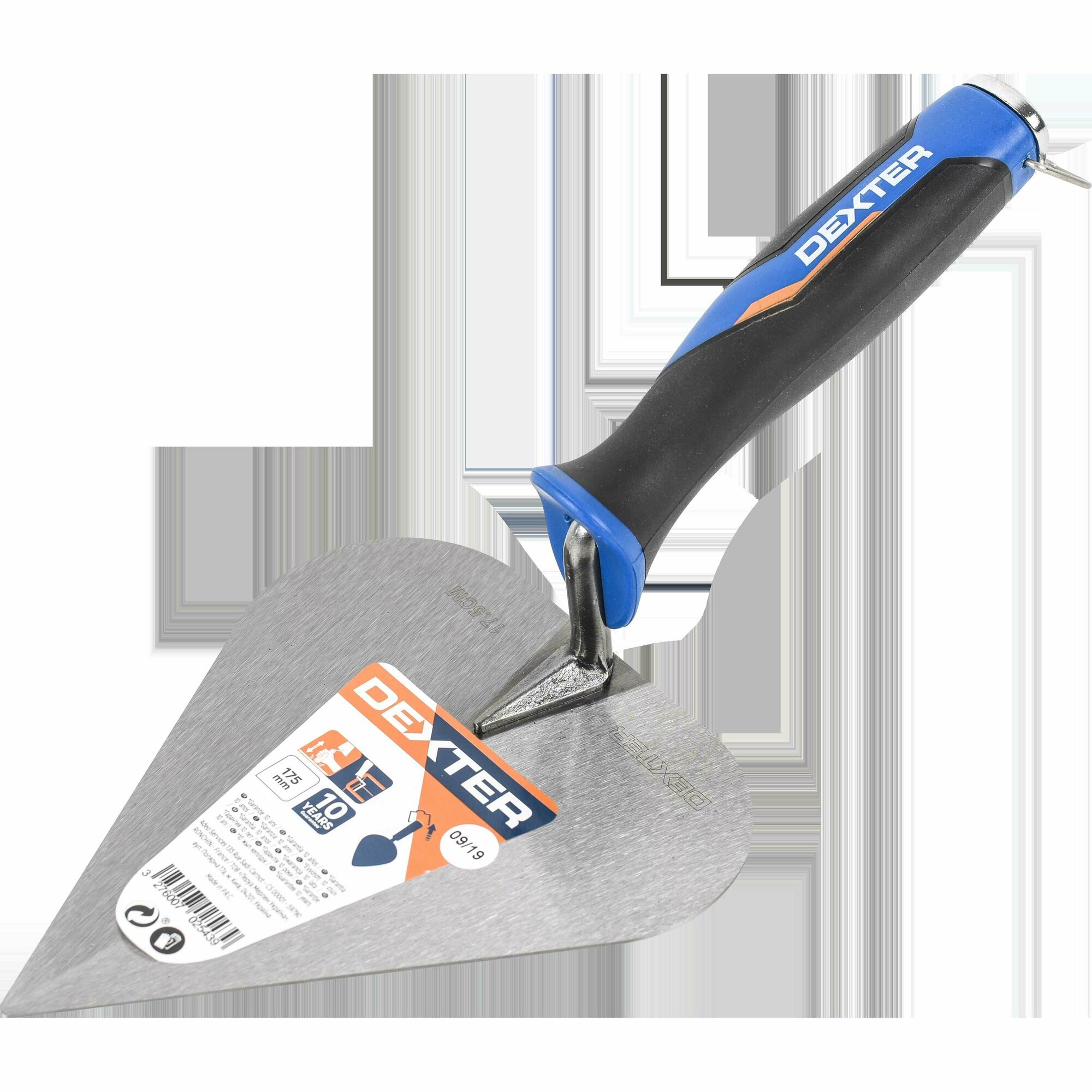 Кельма в форме сердца Dexter — ручной инструмент для строительных и отделочных работ: кладки кирпича и блоков, нанесения штукатурки и шпаклевки. Полотно каплевидной формы позволяет дозированно набирать, распределять по поверхности и разравнивать растворы различной вязкости. Общая длина инструмента составляет 32 см, длина рабочей планки — 17,5 см, ширина — 150 мм. Основной материал — углеродистая сталь.