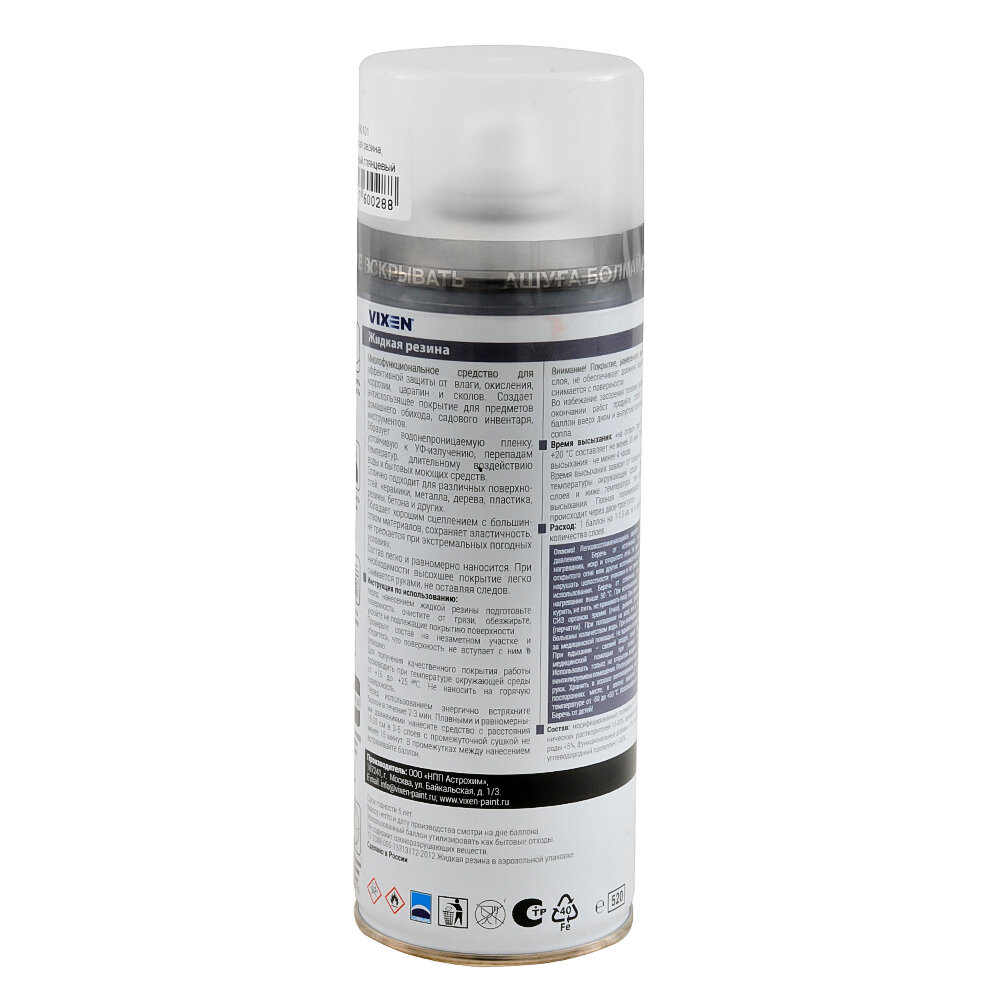 Аэрозоль Vixen «Жидкая резина» — универсальное средство для качественной защиты от сколов, царапин, влаги, окисления и коррозии. Образует прозрачное глянцевое антискользящее покрытие в виде непроницаемой пленки, устойчивой к ультрафиолету, температурным перепадам и продолжительному воздействию моющих средств.