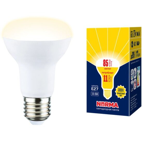 Лампа Volpe Norma светодиодная с цоколем E27 подключается к сети с напряжением 170-240 В. Потребляемая мощность — 11 Вт. Изготовлена в форме гриба диаметром 63 мм. Светит теплым белым светом (3000 K). Работает без пульсации, экономит до 90% электроэнергии. Световой поток — 880 лм (норма освещенности на м² помещения — 150-200 лм).